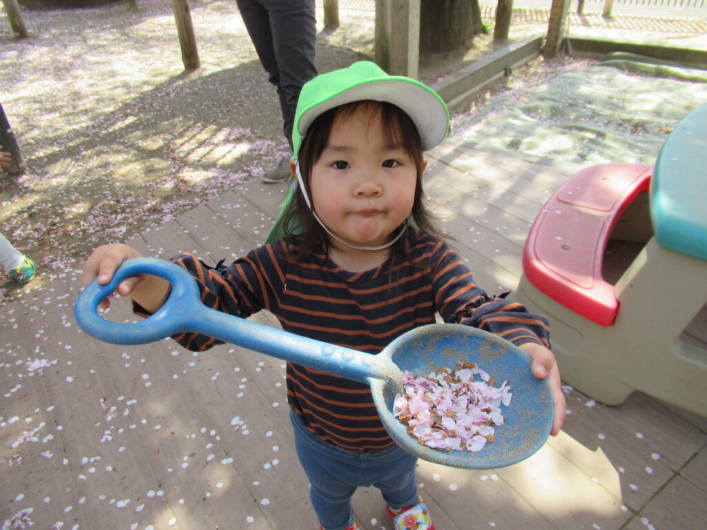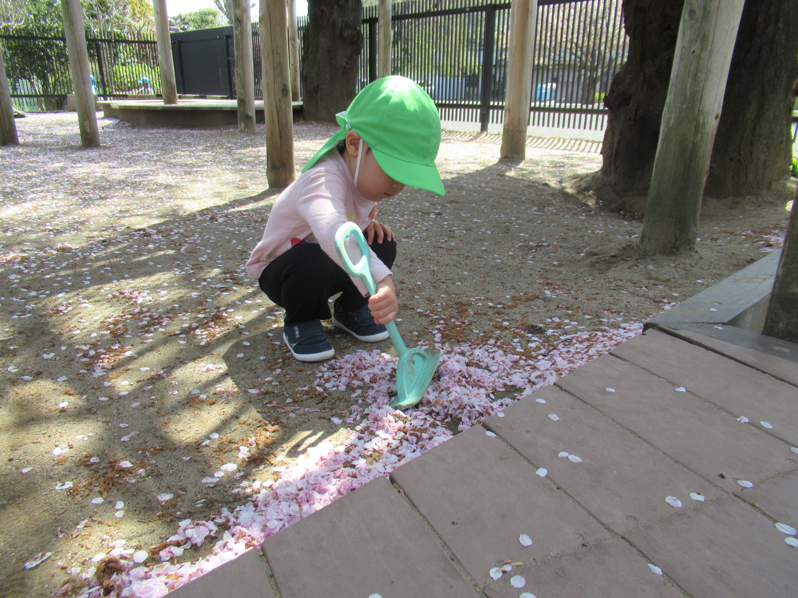 桜の花がたくさん散り、所々ピンク色になっていた園庭。いたるところで、花びらを集めては上から降らせ、楽しむ姿が見られました。工事の様にシャベルでかき集める子、「みて、さくら!」とたくさん集める子、カップに詰めて「さくらプリン」を作る子など、それぞれが春の自然に触れて遊んでいました。