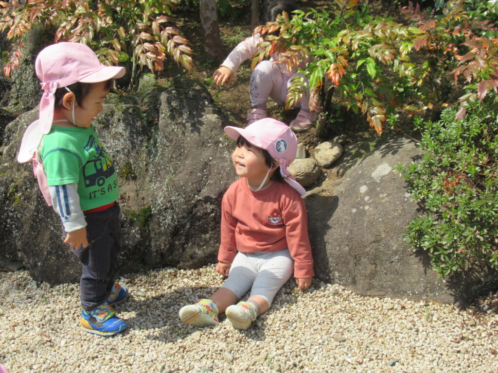 楢の里の中庭に行きました。広い芝生の上で追いかけっこをしたり、小石を集めたり、虫を探したり、木が生い茂っている中に入っていき探索をしたりと、笑顔いっぱいで遊んでいました。