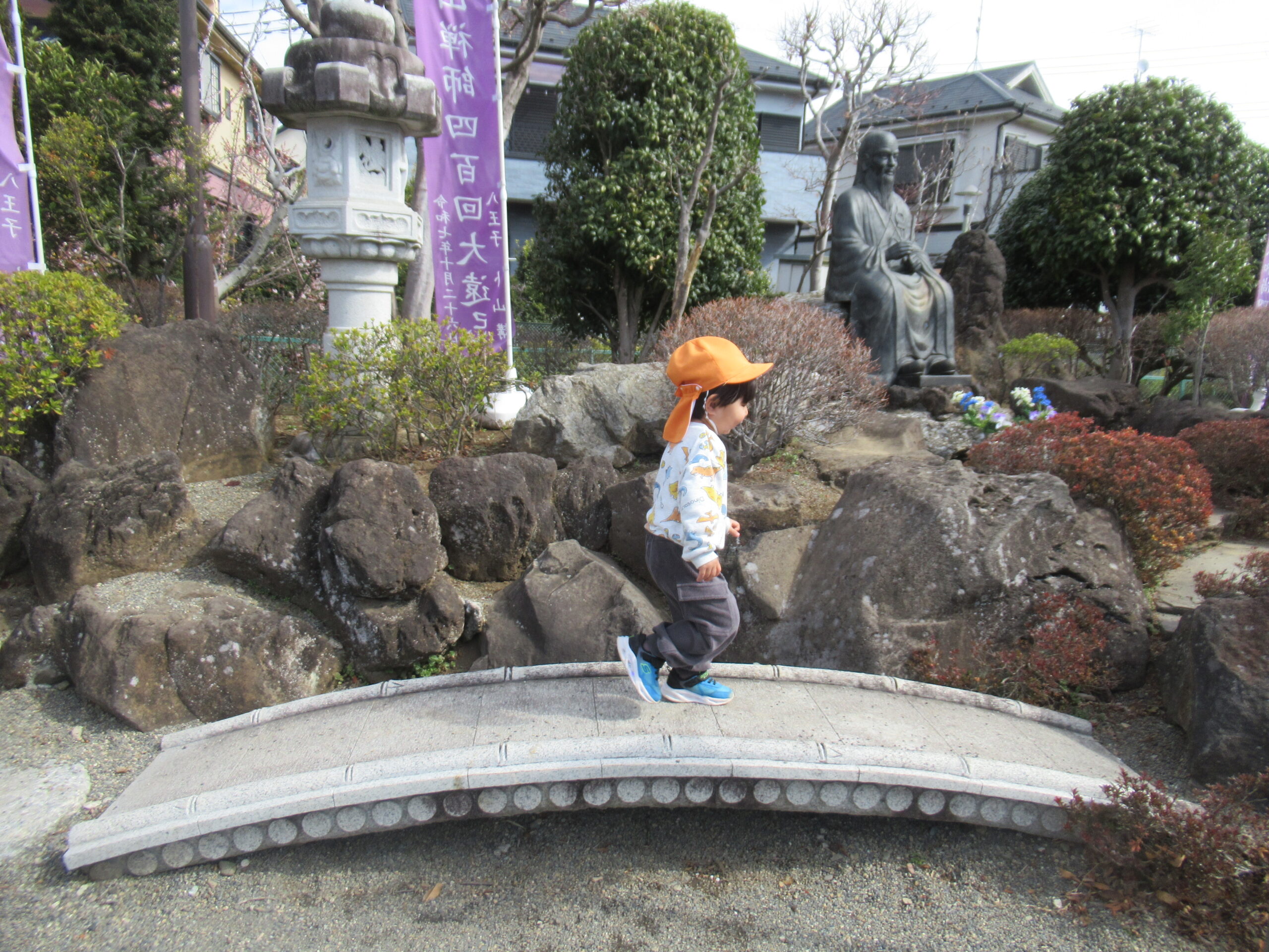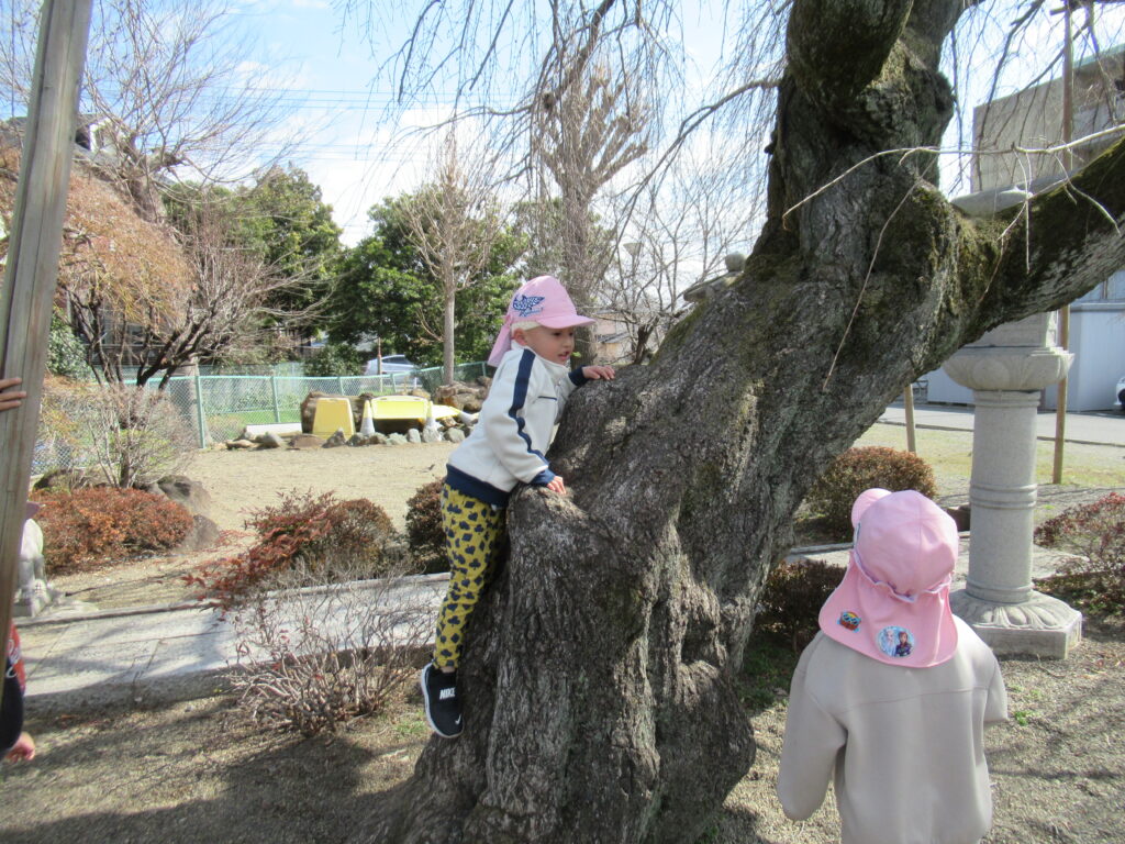 楢の里広場では卜山庭園を眺めて楽しむ子や、木に登って体を動かして遊ぶ子の姿が見られました。