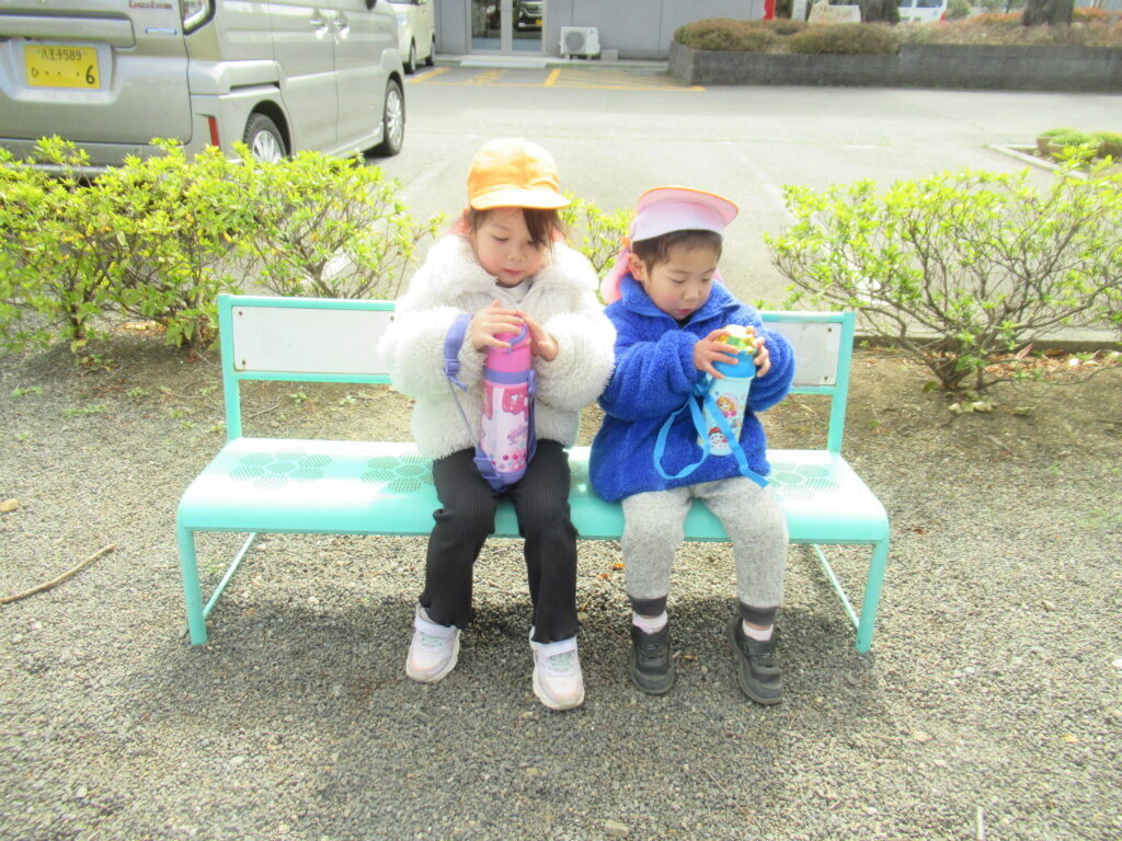 遊びの途中には、自分達でベンチに座り、水分補給をする姿も見られ、休憩を取りながら過ごすことが出来ていました。