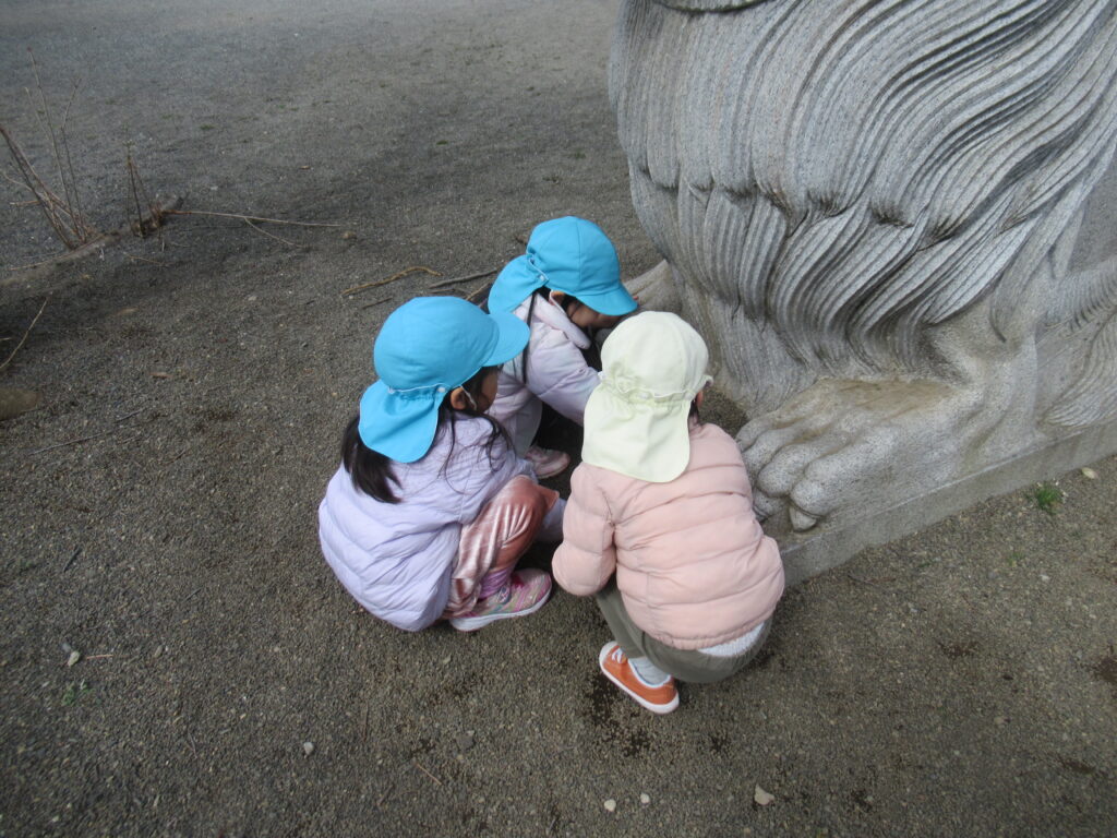 ライオンの像には「たくさん食べてね。」と声を掛けながら、砂利や枝を用意して食べさせてあげる姿もあり、