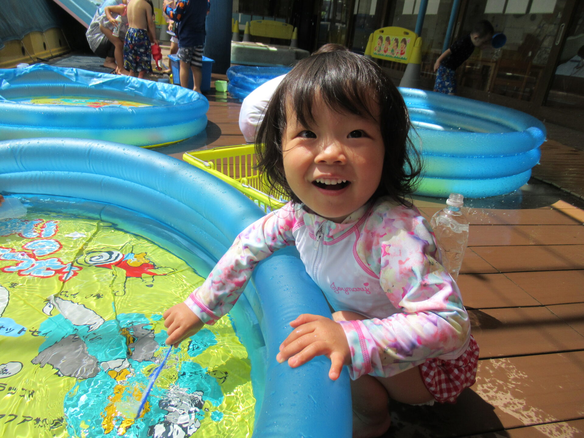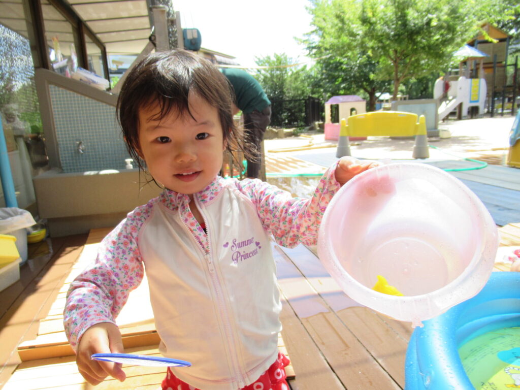 2歳児心・善組 今日はみんなが大好きな水遊びをしました。自由自在に変形する水を、様々な入れ物に入れてはじっくりと観察する子ども達。無色透明な水は、入れ物の色によって、また角度によって色々な色に見えます。「きれい」「光っているよ」「気持ちいい」心の中の声が言葉となって出てきます。サラサラ流れる水、バシャバシャと音をたてる水・・・。水遊びを通して、見て聞いて感じてこの夏を楽しんでもらいたいと思っています。