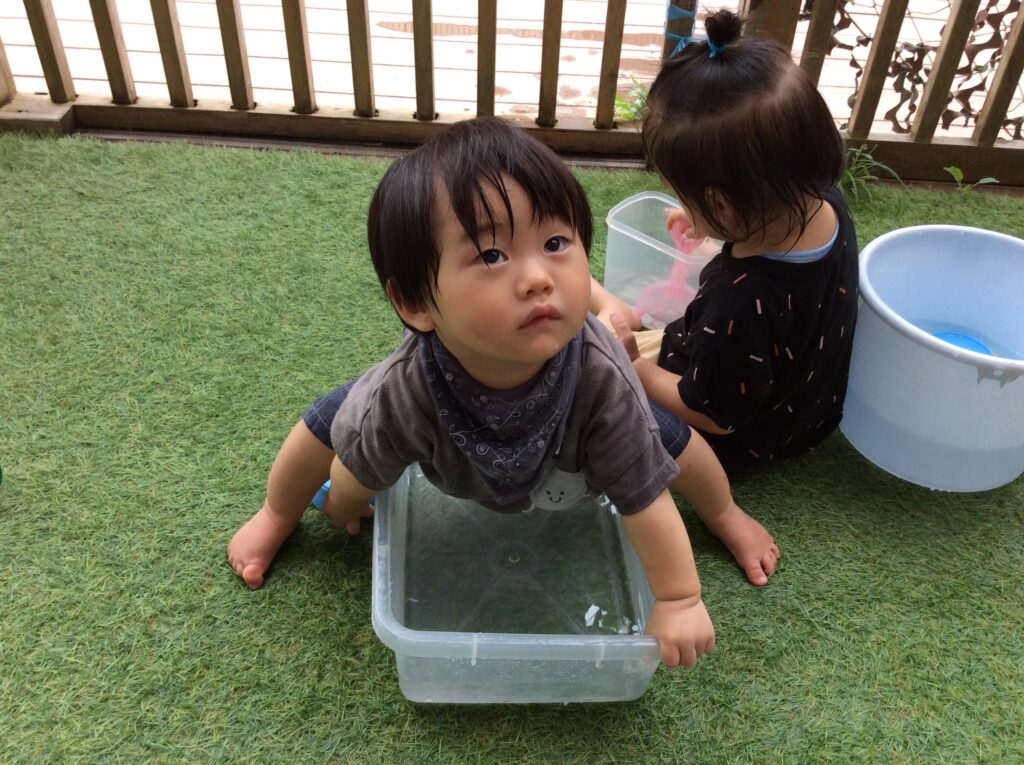 水遊びをしました。ままごとのお玉で水をすくおうとしたり、カップに入れようとしたり集中して遊んでいました。顔に水がかかっても気にせず楽しそうに遊び続けていました