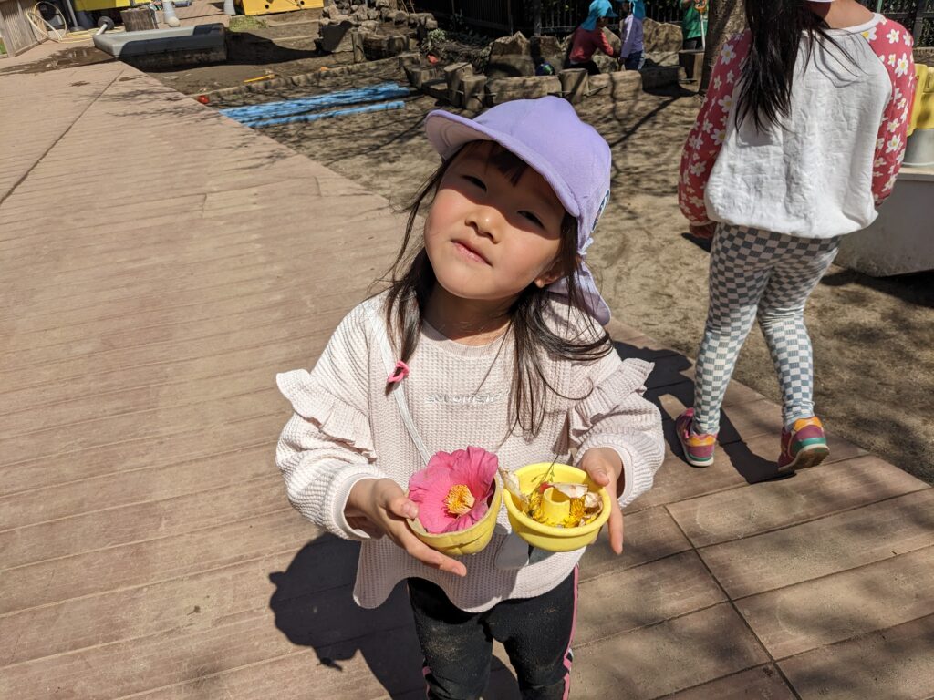また、ハクモクレンの良い香りを嗅いだり、落ちていた花を大切そうに拾いおままごとに使ったり、視覚や嗅覚、触覚など五感を通して、子どもたちは春の訪れを感じていました!