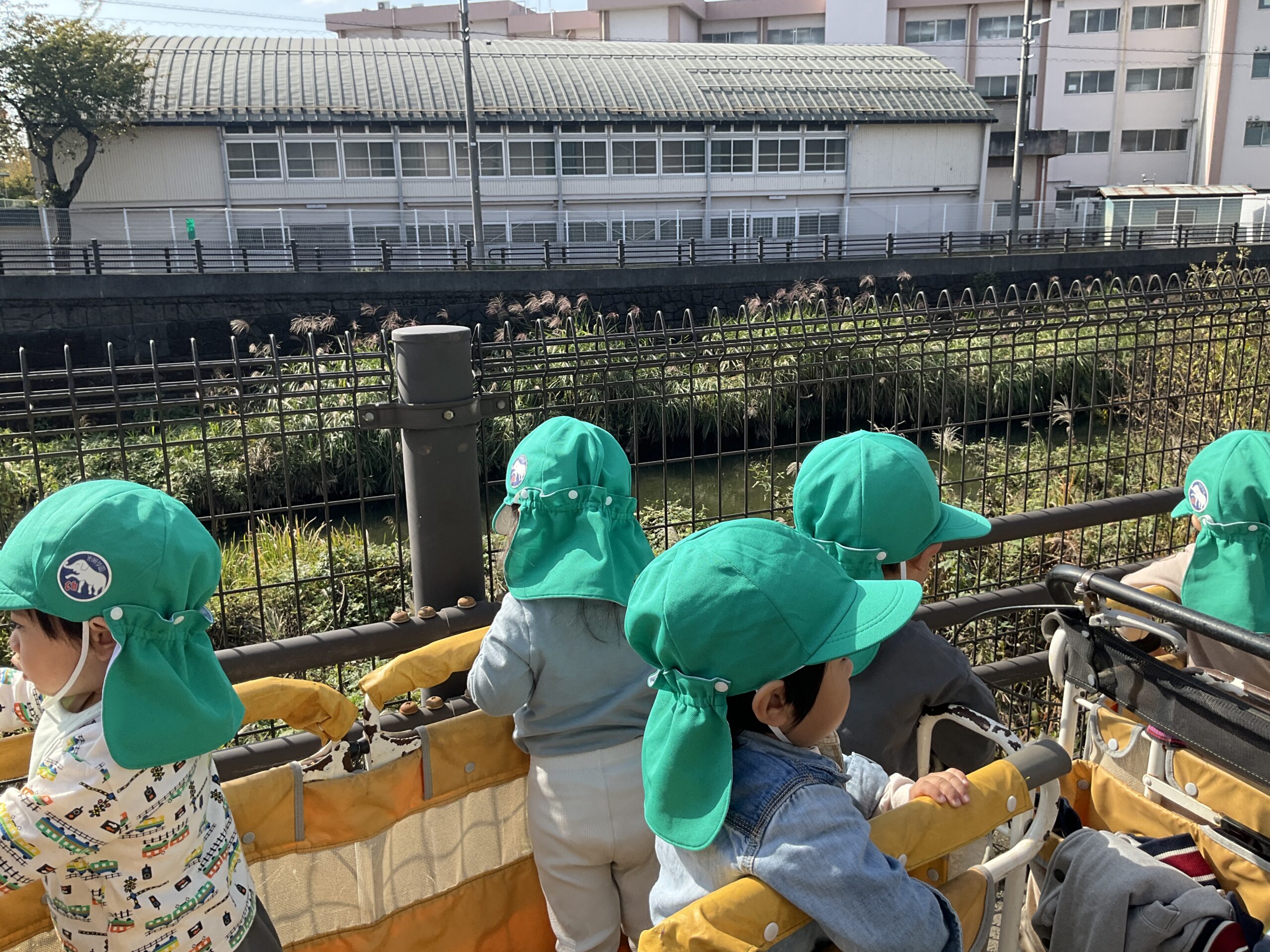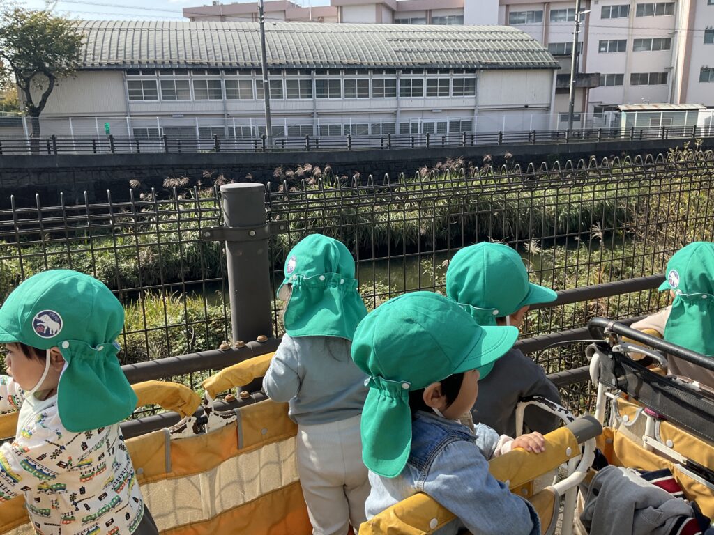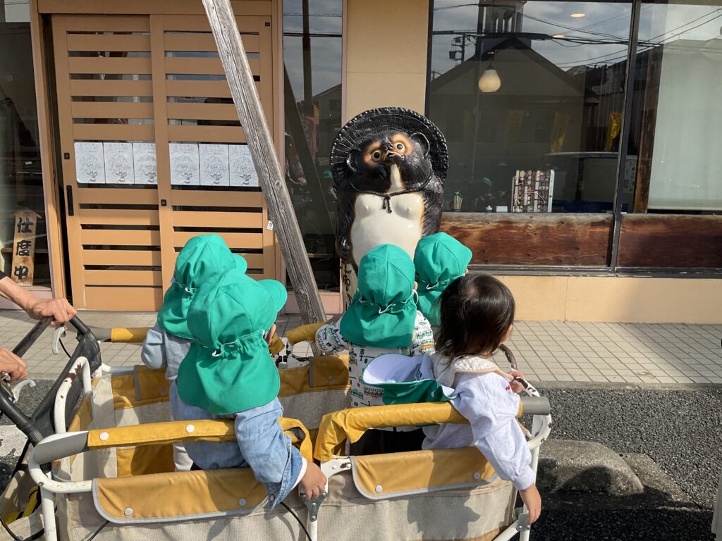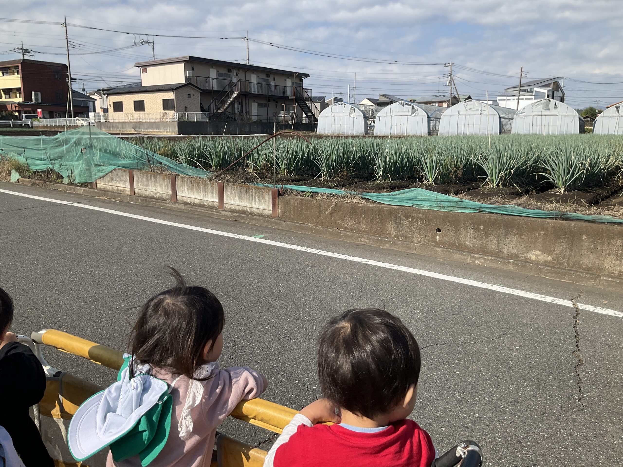 輝組の子どもたちが街探検をしました。いつもと違う道を進み、ネギ畑やたぬきの置物、風に揺れるススキなど新鮮な発見をしました。みんなで楽しく街探検をすることが出来ました。