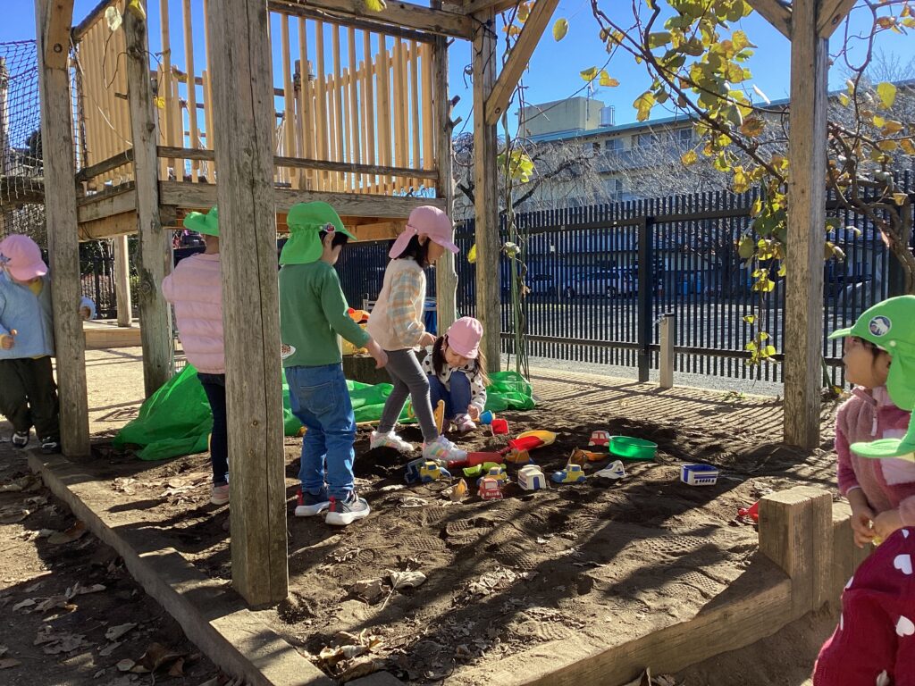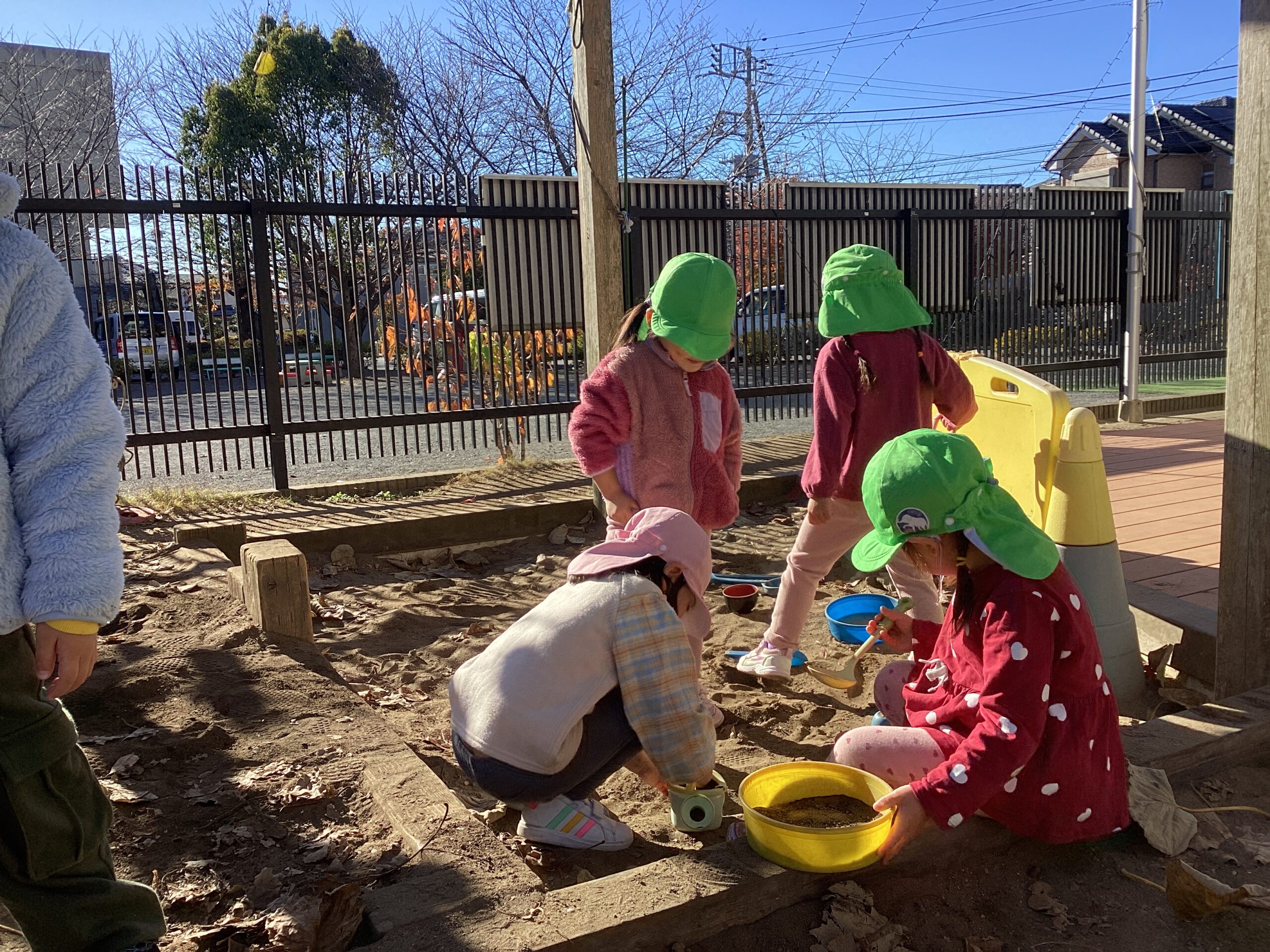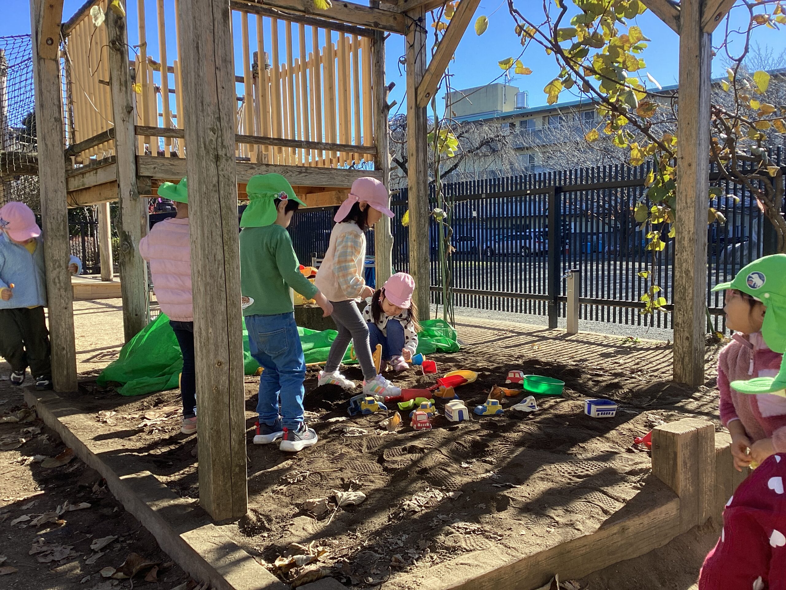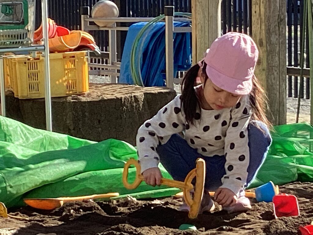 砂場遊びを楽しみました。スコップやバケツ等使いたいものを「順番ね!」と声をかけあいながら交代で使う姿が見られたり、「何しているの?私もいれて」という友達にも「いいよ。」とすぐに仲間に入れてあげたりして、複数の友達と遊びながら社会性も育っています。