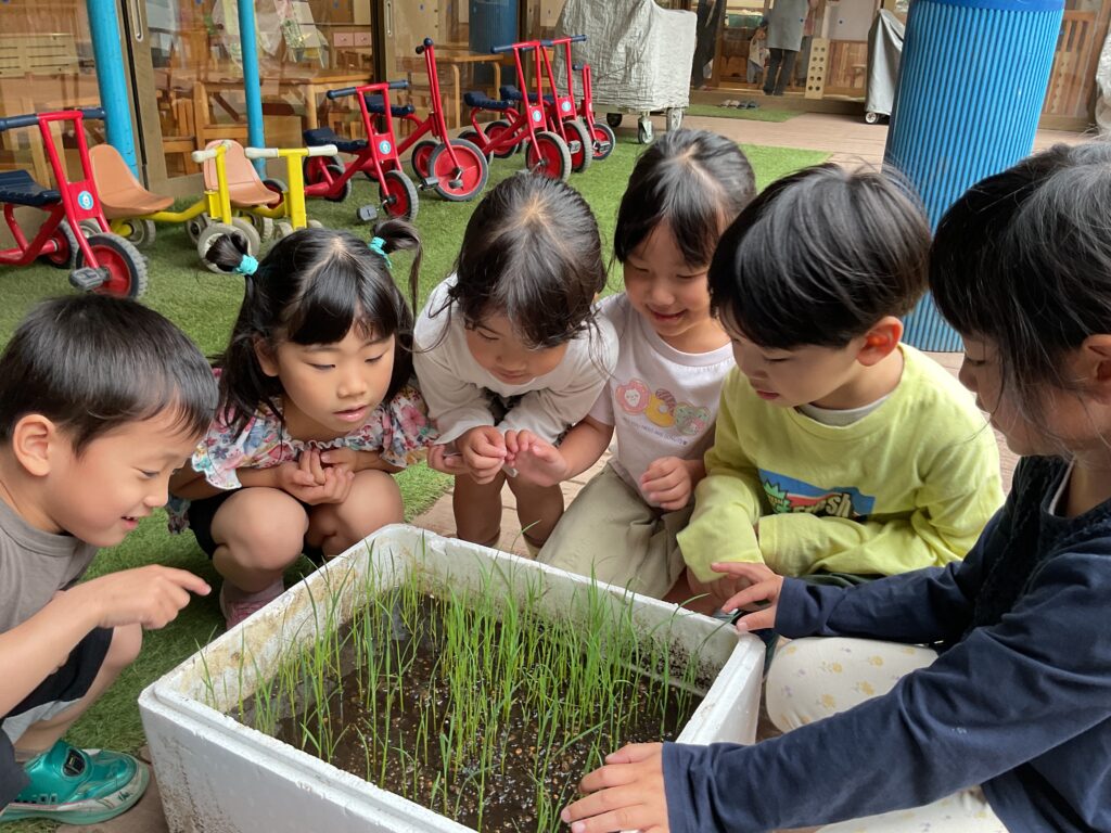 植えた種もみが芽を出し、真っすぐ伸びているのを見て「すごいおおきくなってる!」「全部お米なの?」と疑問や驚きを口にしながら、観察する子どもたち。協力して土の入ったバケツを運び、根が切れないよう慎重に稲を集めて、バケツの土へ移し替えていました。