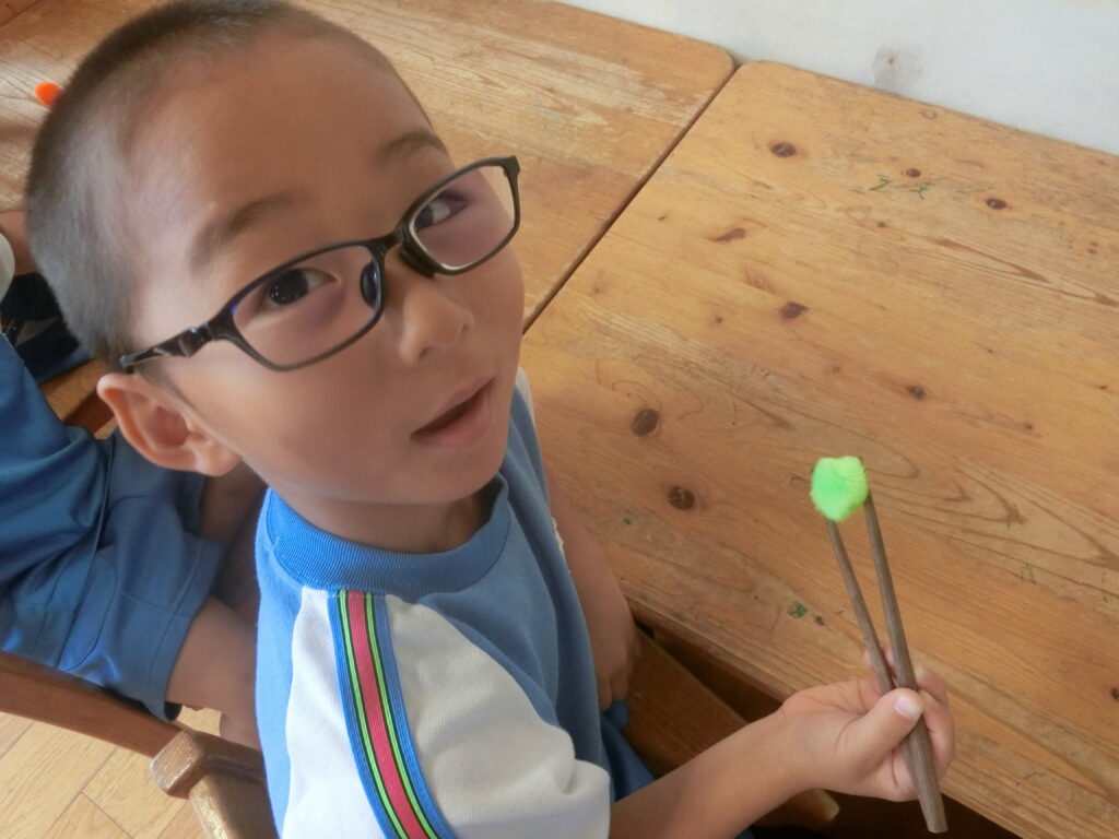 幼児組に箸指導をしました。元気いっぱいに『見て!できたよー!』と楽しく箸の持ち方の確認ができました。愛組はまだ箸が持てない子はスプーンの持ち方から練習。上手に持てると箸もやってみたいとチャレンジする姿も見られました。もっとやりたいという子が多かったので、また練習したいと思います。来月は心・善組を対象に行う予定です。