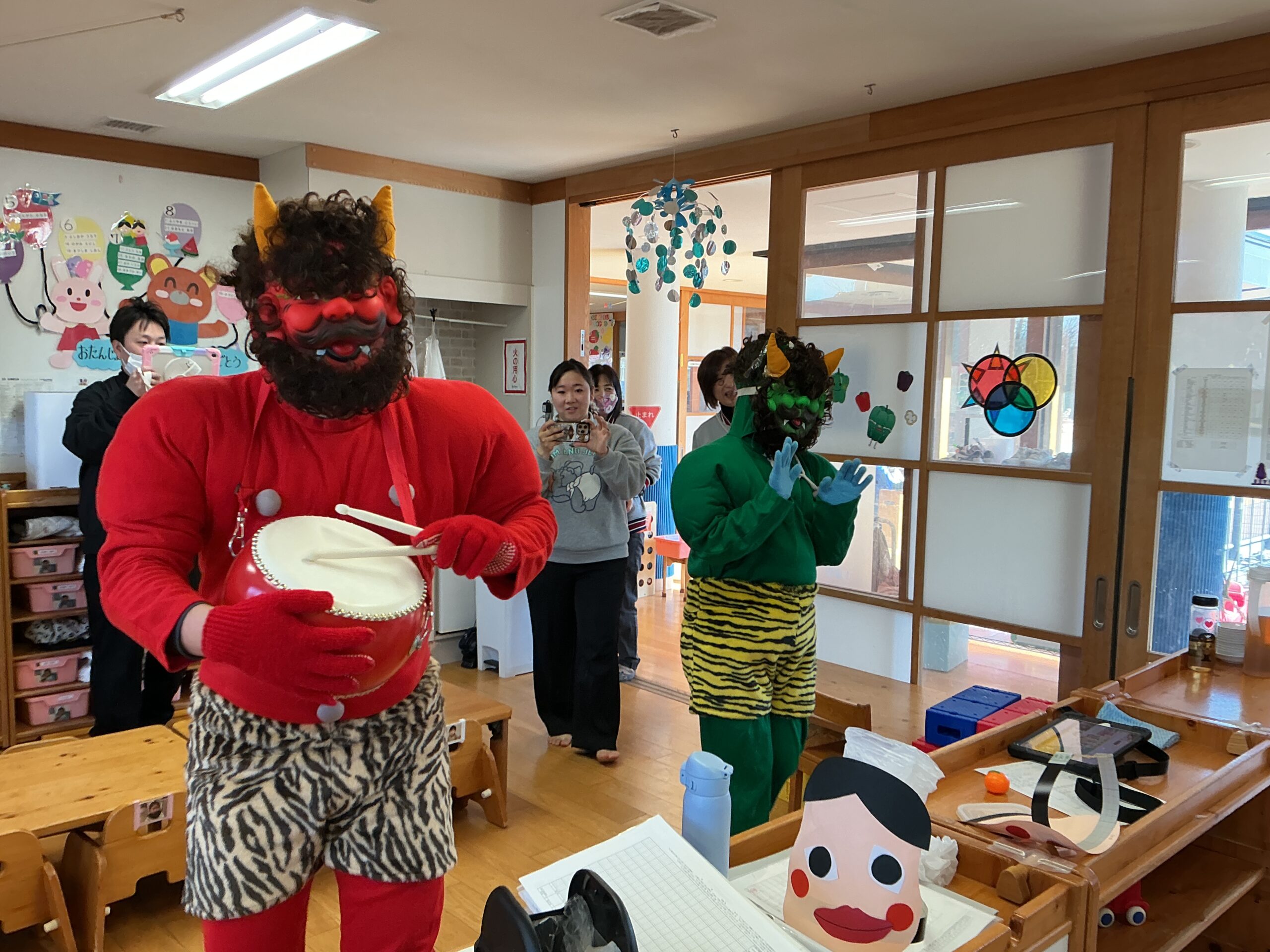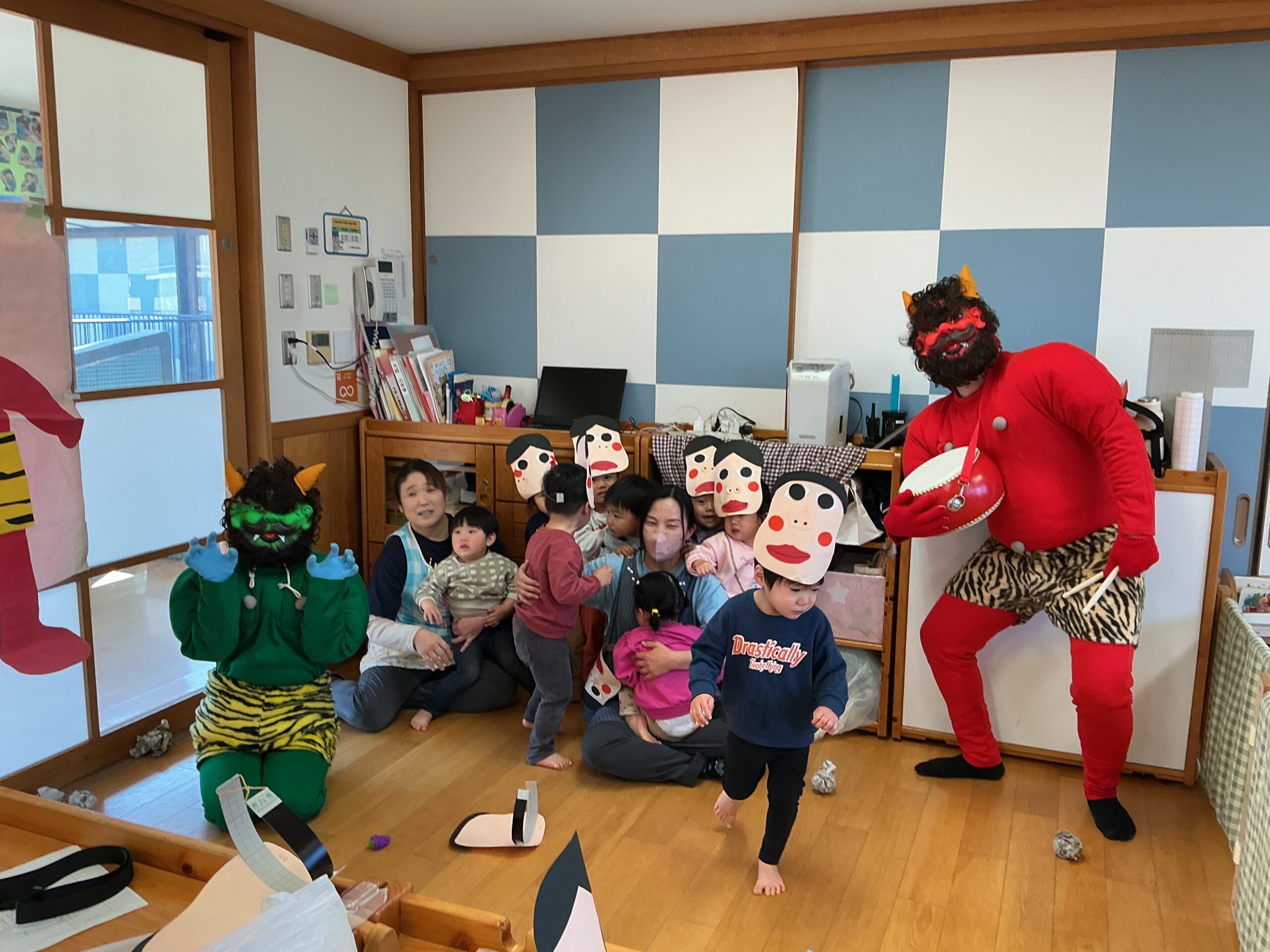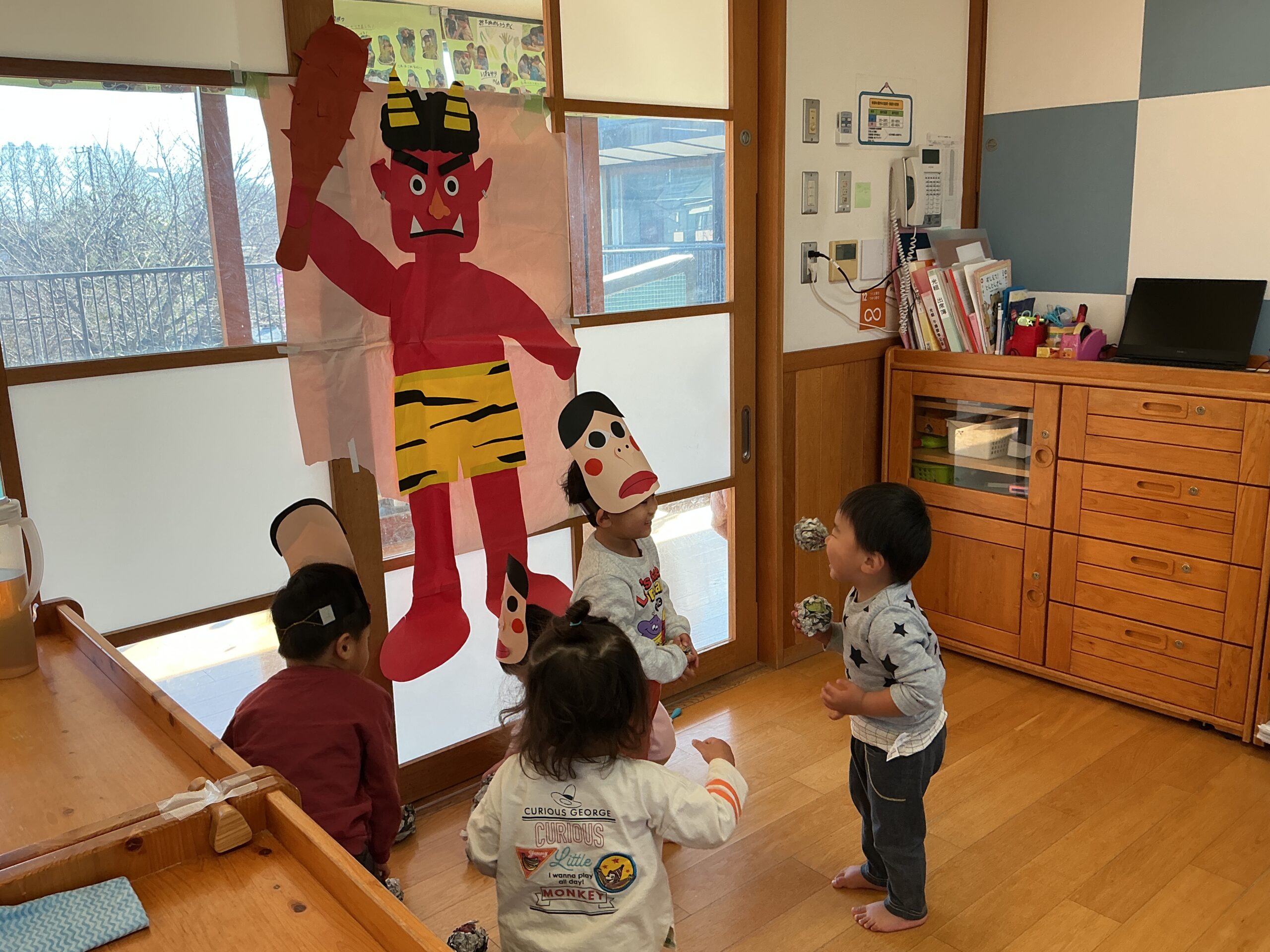 節分会が行われ園にも鬼がやってきました。朝から模造紙に描かれた鬼に「おにはそと、ふくはうち」と新聞紙を丸めた豆を投げて練習していました。いざ保育室に鬼が入って来るとびっくりしてしまい泣いてしまう子もいましたが、最後には一緒に記念撮影をし、季節の行事を楽しみました。