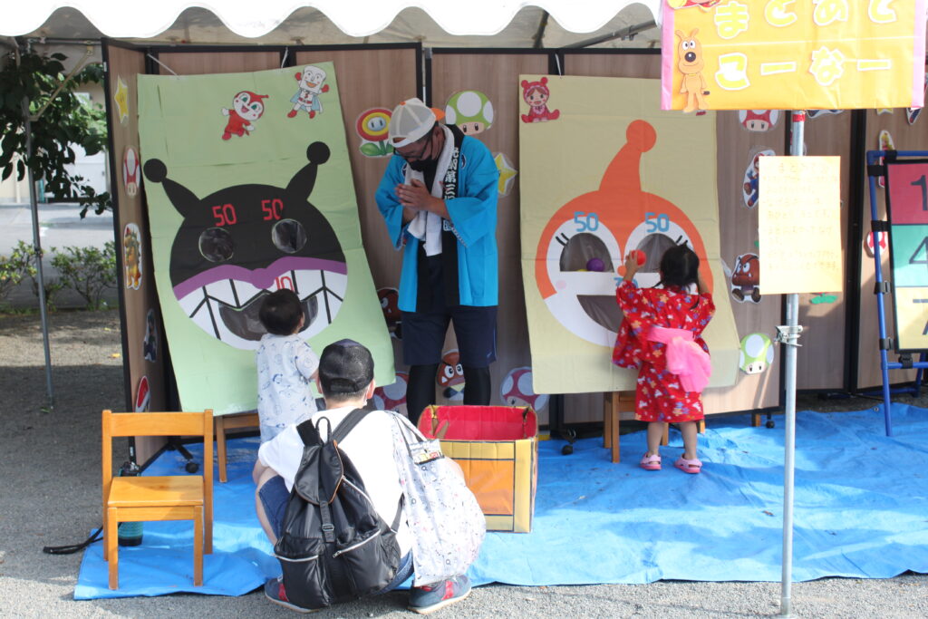 輪投げやストラックアウト、ヨーヨー釣りなどのゲームを親子で楽しみました。また、地域の方や卒業園児も参加してくれて、楢の里中庭ではお神輿を担いだり盆踊りを踊ったりしました。3年ぶりの地域と一緒のお祭りは大盛況でした☆