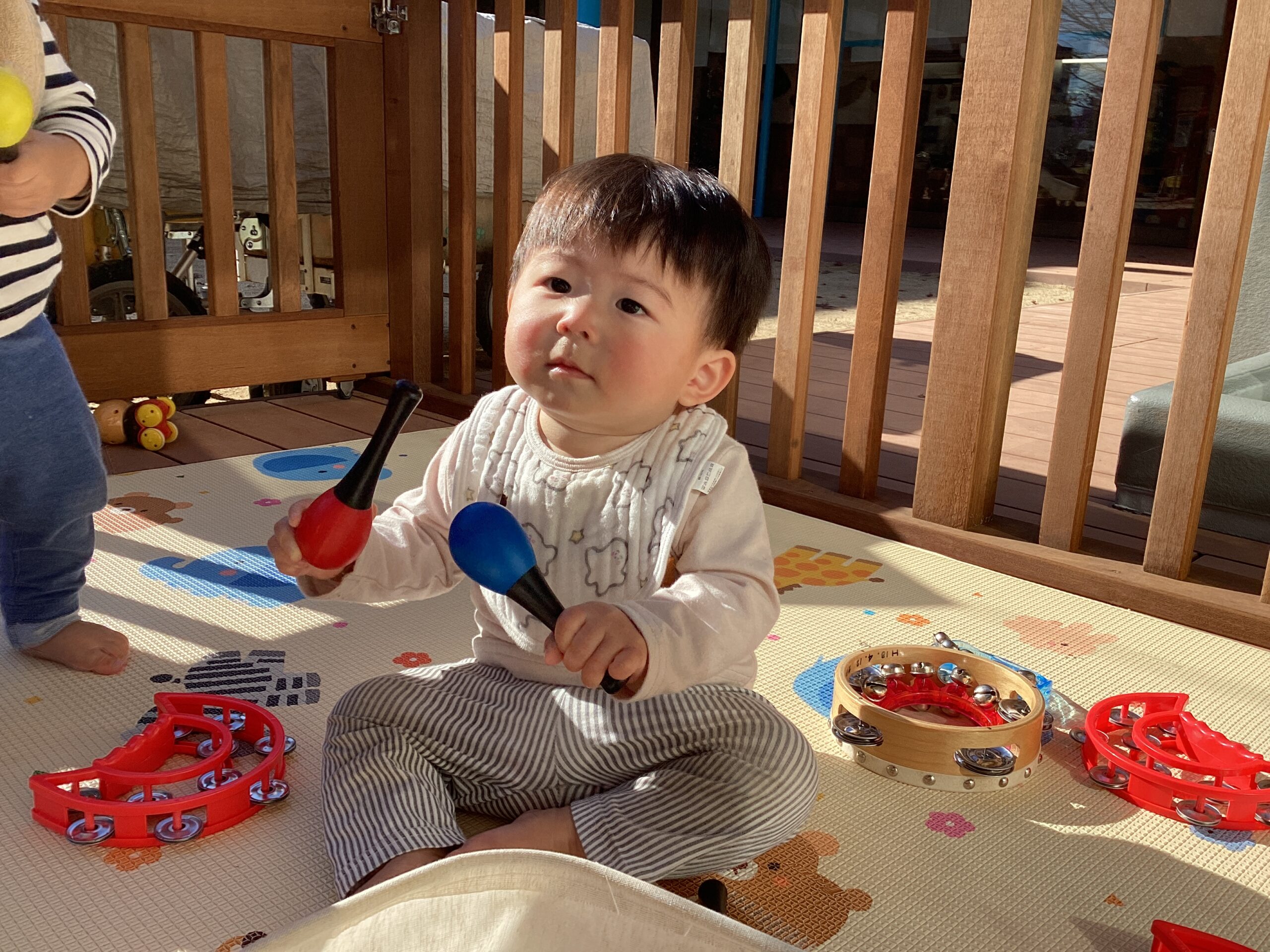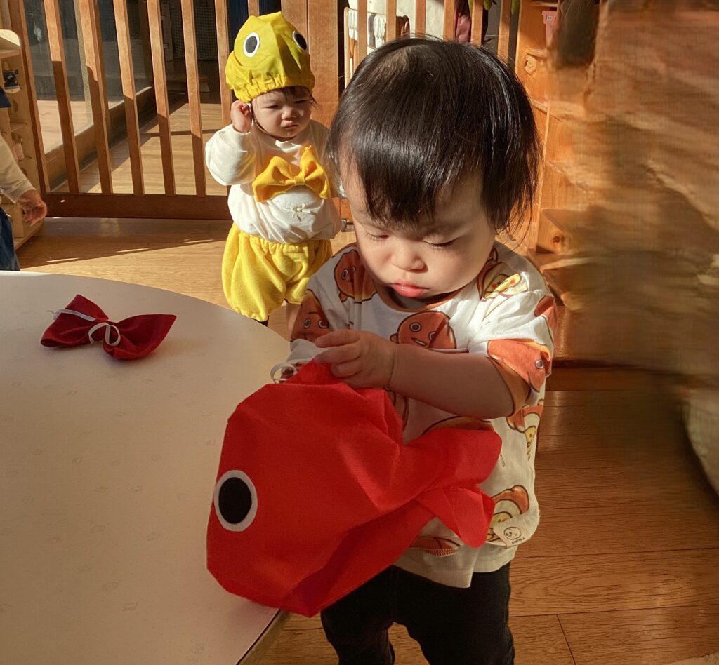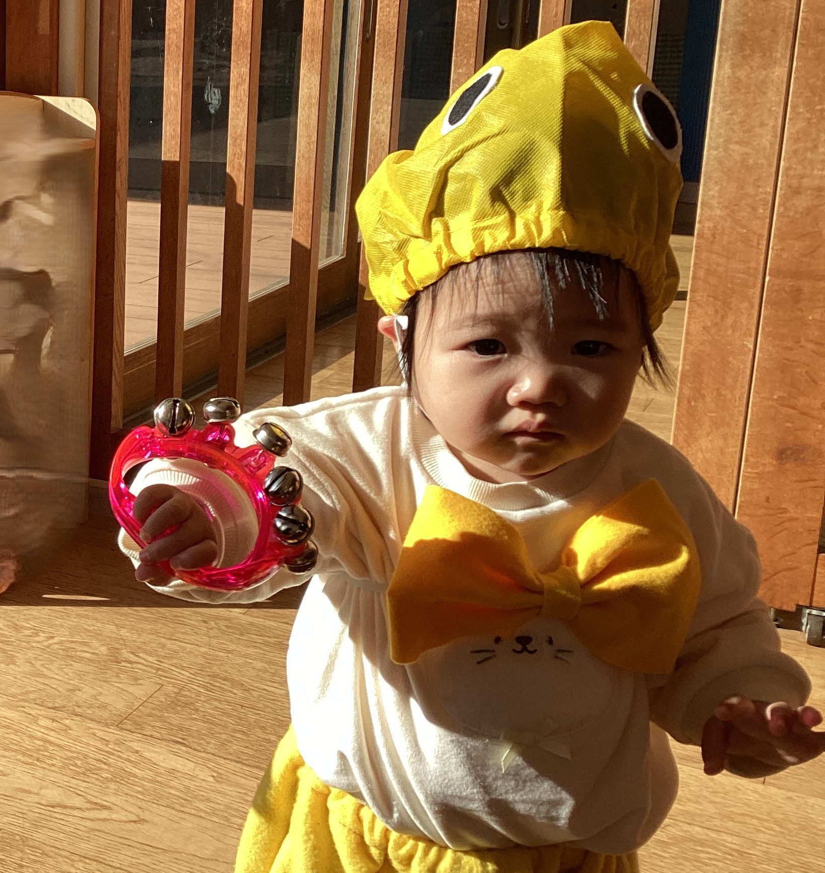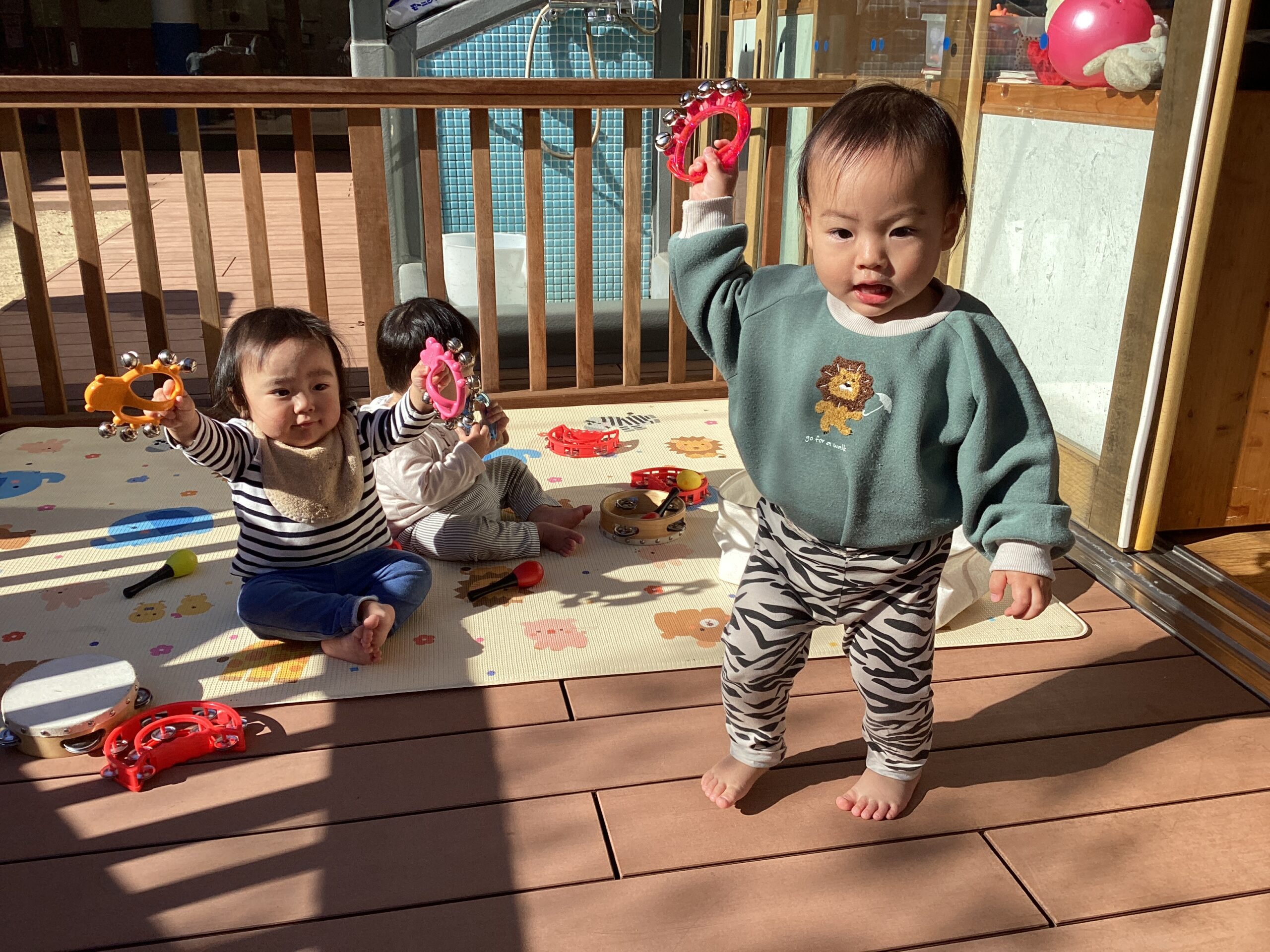 純組の子どもたちはポカポカ陽気の中、テラスで楽器を使ったリズム遊びを楽しみました。更に遊戯会用の衣装を保育者が出してくると、興味津々で手に取っていました。明日の遊戯会リハーサルも笑顔で楽しめるといいなと思います。