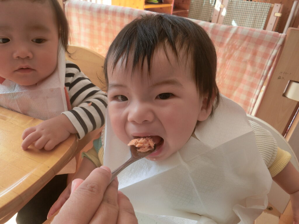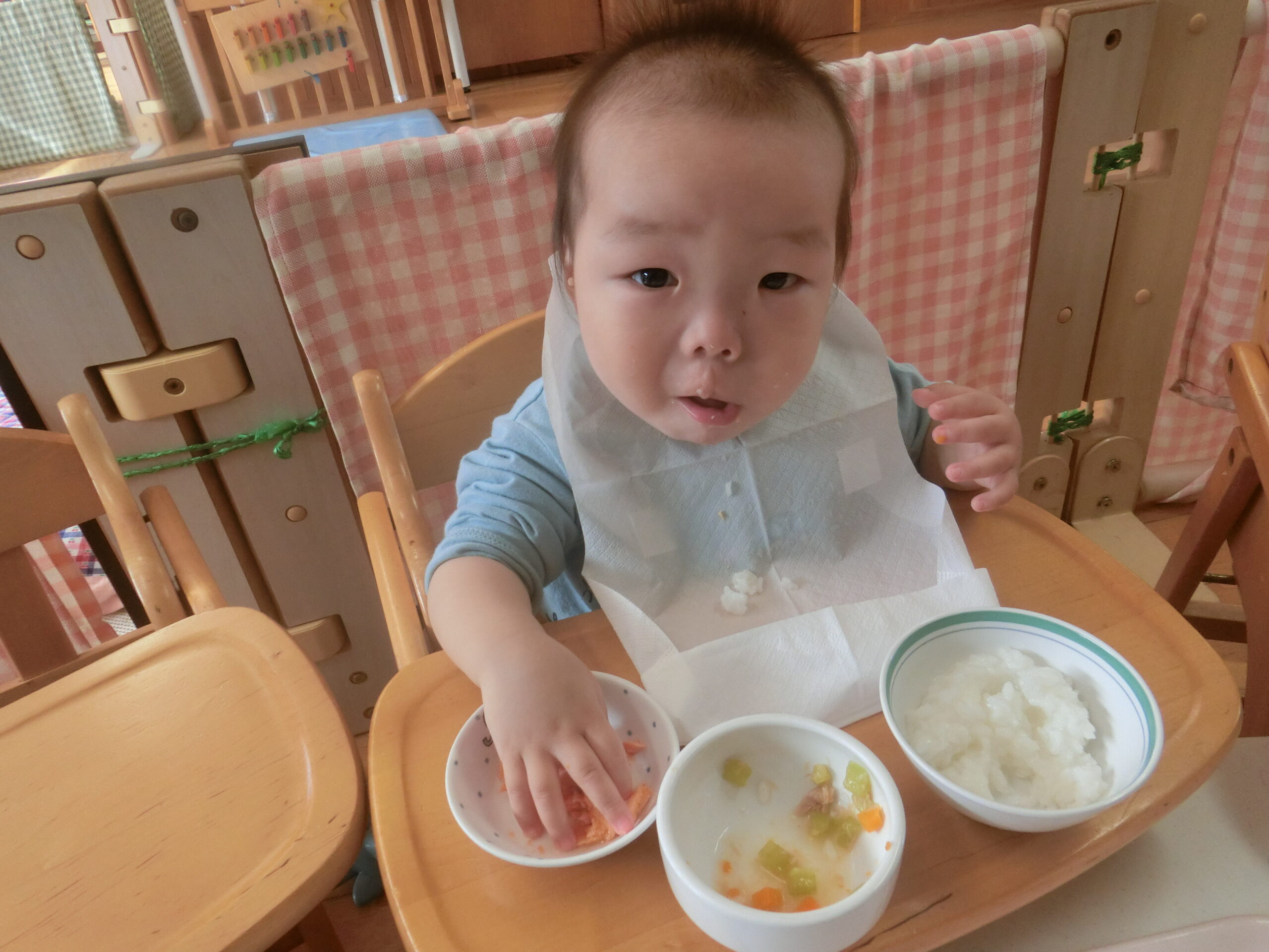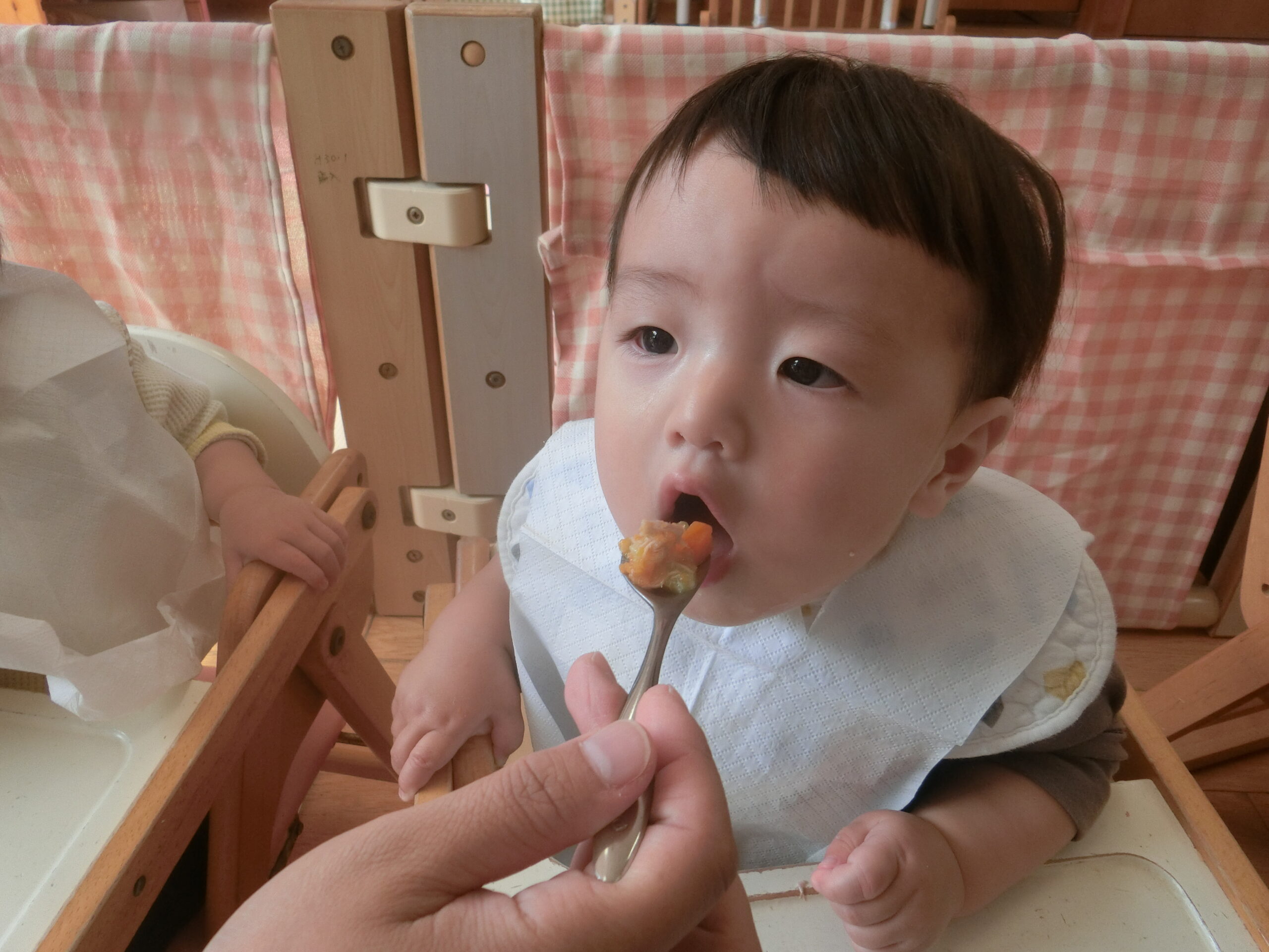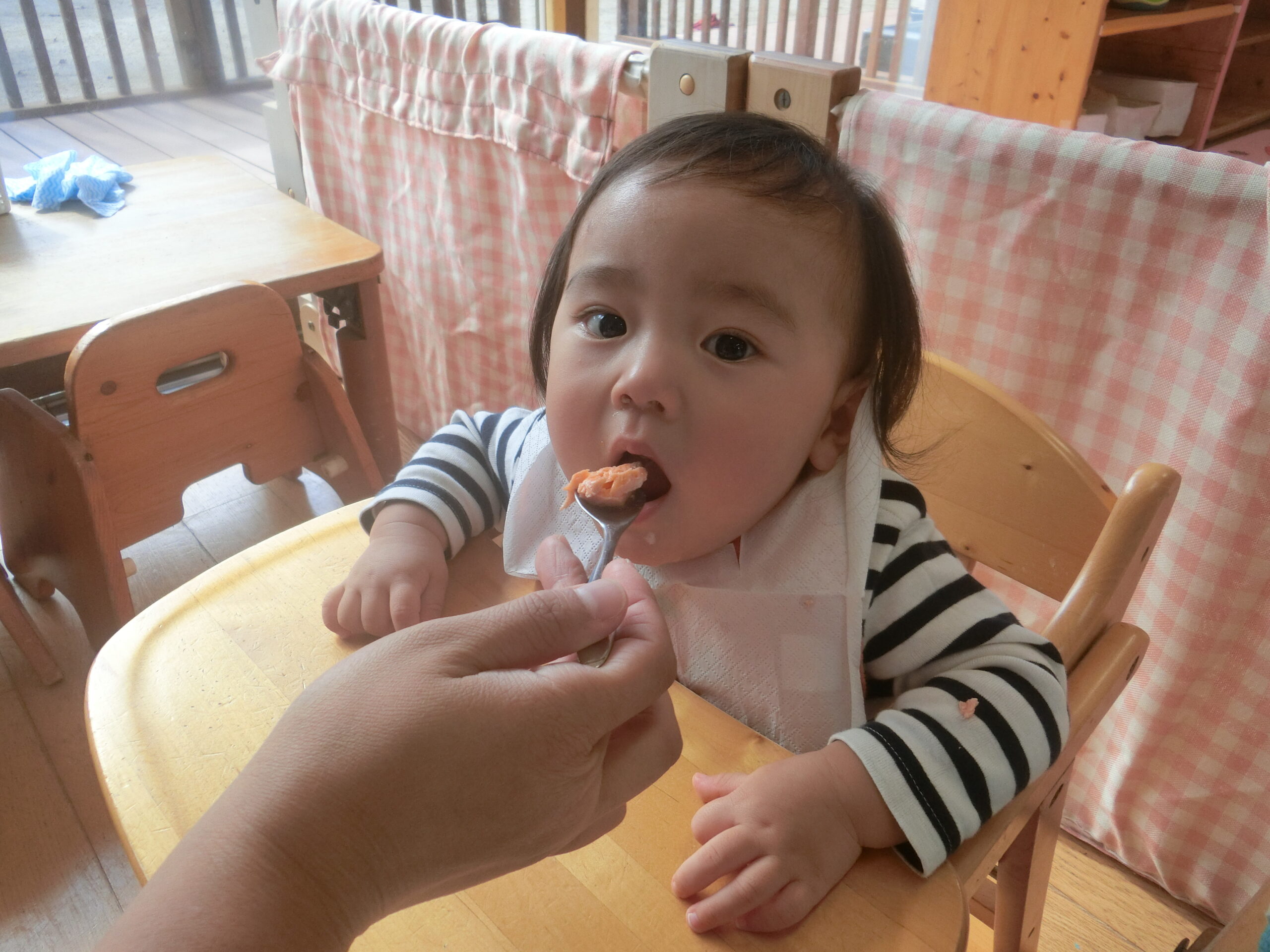 自ら手掴み食べを始める子、足をパタパタさせ嬉しそうに食べる子、みんな可愛らしい口を開けて元気いっぱいに食べています。園では子どもたちの成長に合わせた優しい味と食感の離乳食で、子どもたちの成長を応援します。