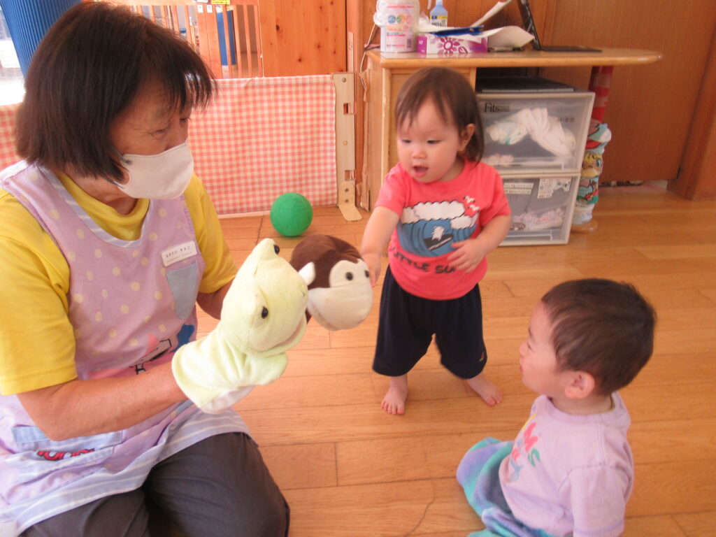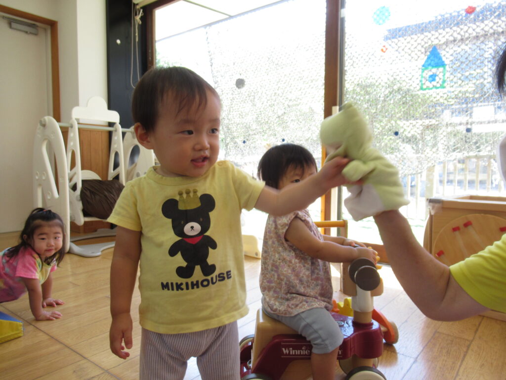 テラスやお部屋で過ごしました。テラスのブランコでは、揺れるたびに「キャッキャッ」と声を出して喜んでいました。カエルとサルのパペットが登場すると、ドキドキしながら手を出す子、興味津々の子、少し怖がって後ずさりをする子、など様々な反応が見られました。秋の実りがたくさんついている室内飾りが扇風機の風に吹かれるのを見て、触りたくて「抱っこして」と両手を出したり、指を差して「う、う!」と教えてくれたりしました。