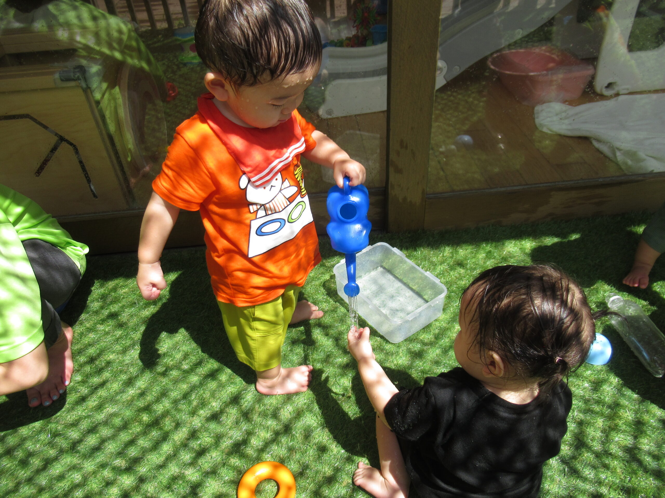 今日も朝から気温が上がりとても暑い一日でしたね。純組はお部屋の前のテラスで水遊びをしました。園での水遊びにもすっかり慣れ、保育者が窓を開けるとよちよちと急ぎ足でテラスに出てくる姿がとても可愛らしい純組の子どもたちです。ダイナミックにお水に顔をつけて遊ぶ子や、お友達にじょうろで水をかけてあげる子など、遊び方はそれぞれですが水に触れる気持ち良さを全身で感じながら楽しんでいます!
