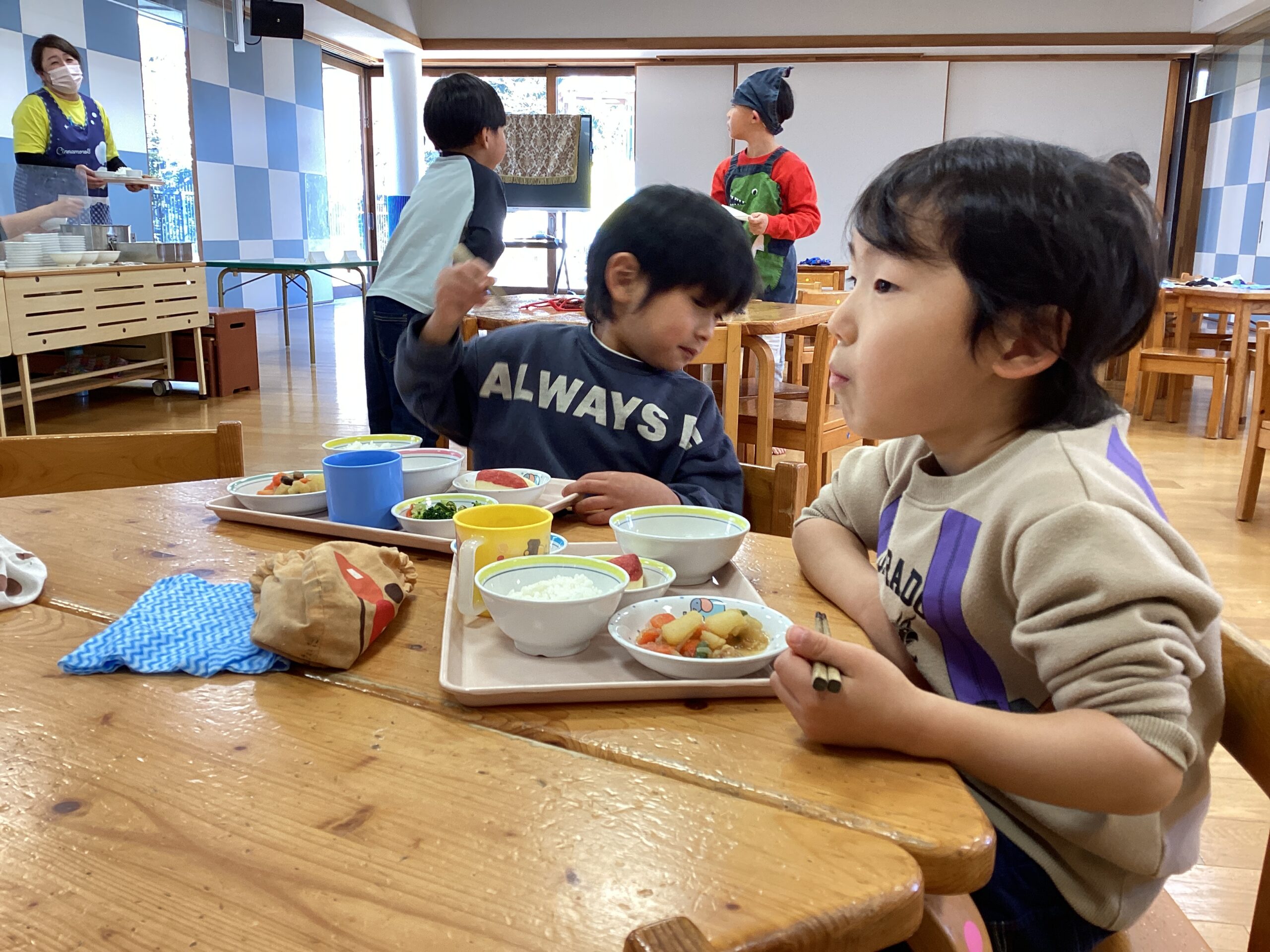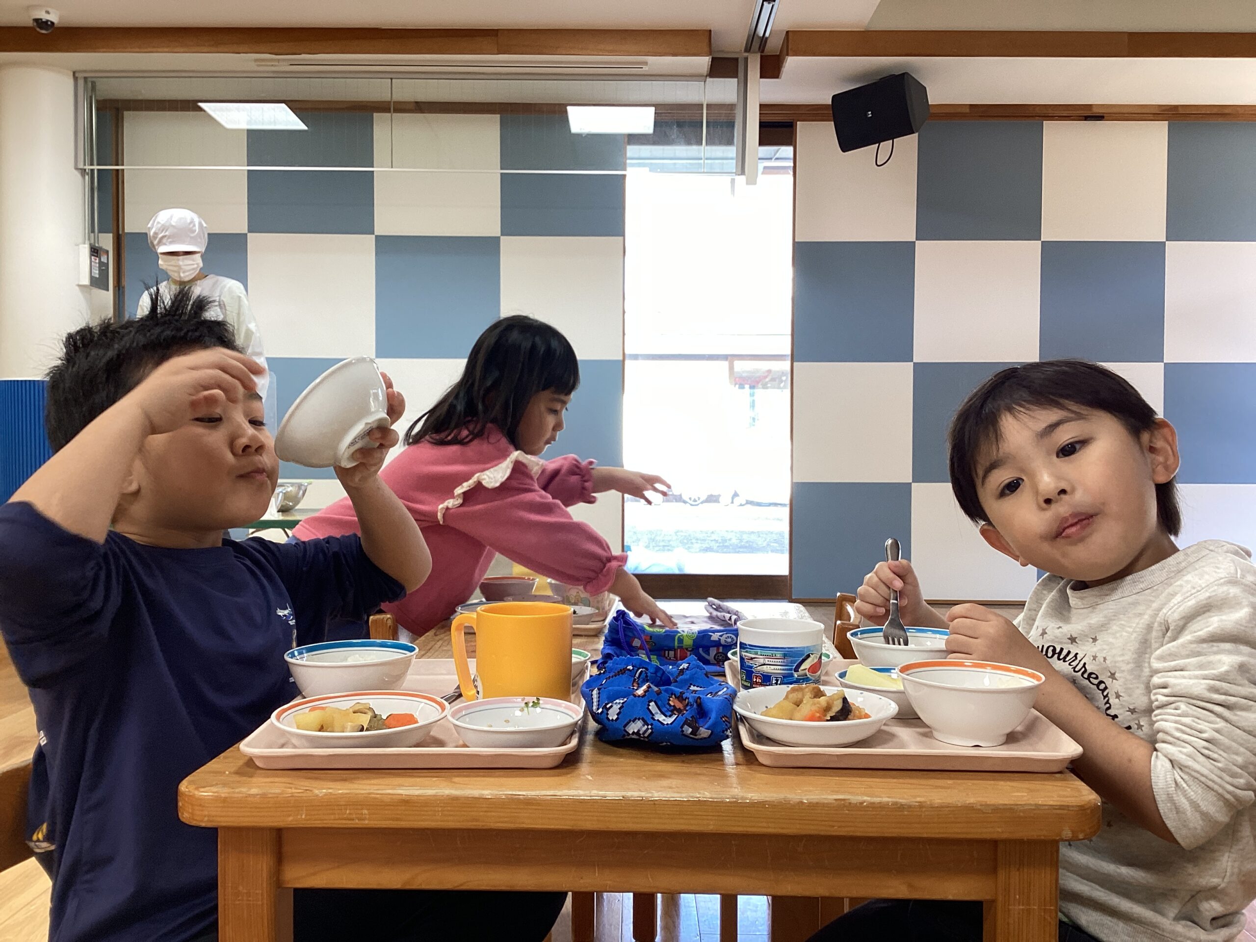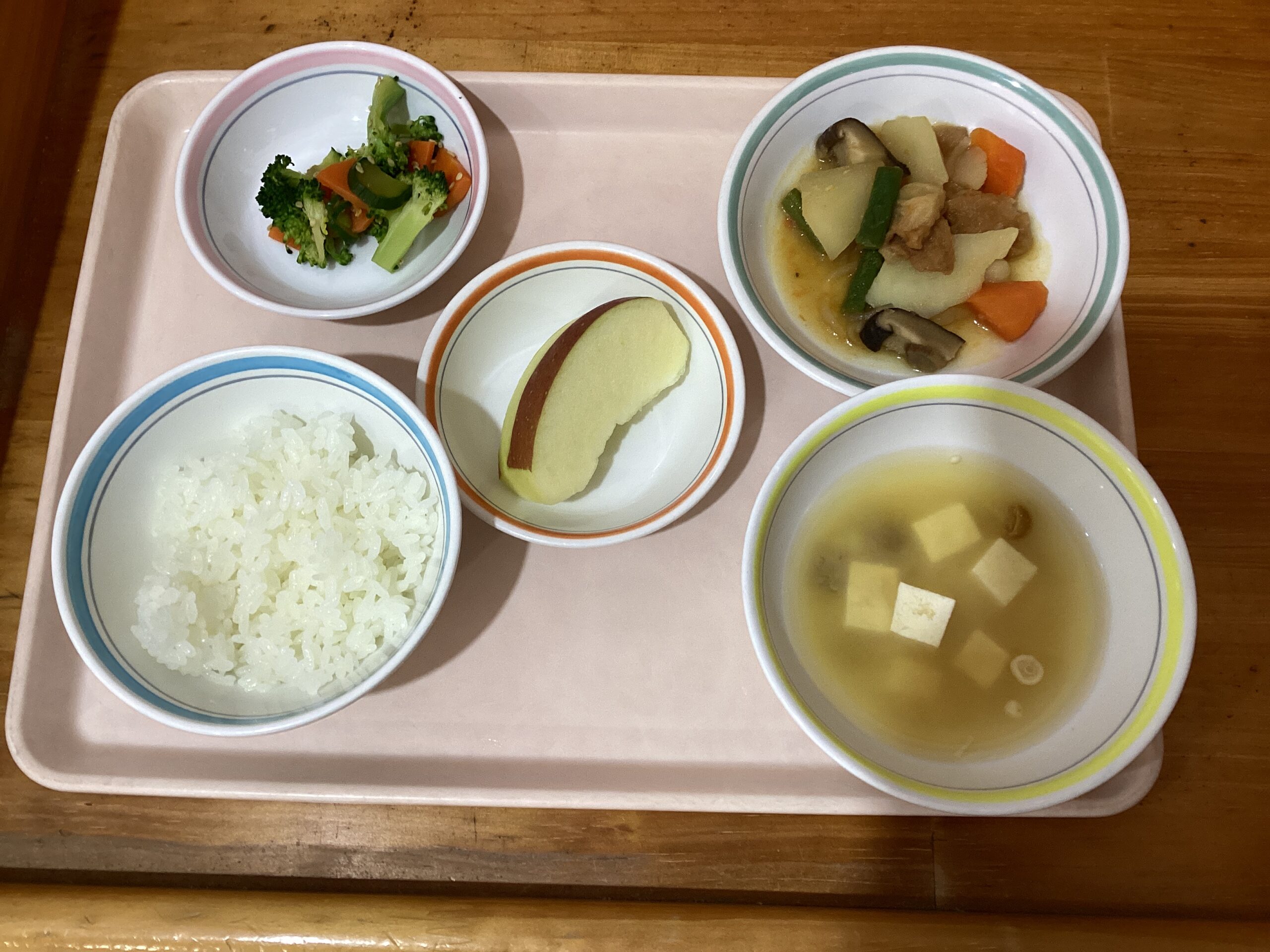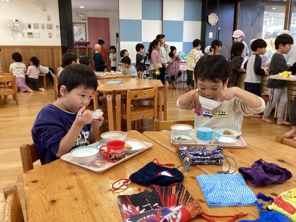 子どもたちが楽しみにしているお給食。給食の放送が流れると大喜びです。 今日は精進料理で、お野菜と油であげたお麩の献立でおいしくいただきました。これからも食事を楽しむ心を大切にしたいです。