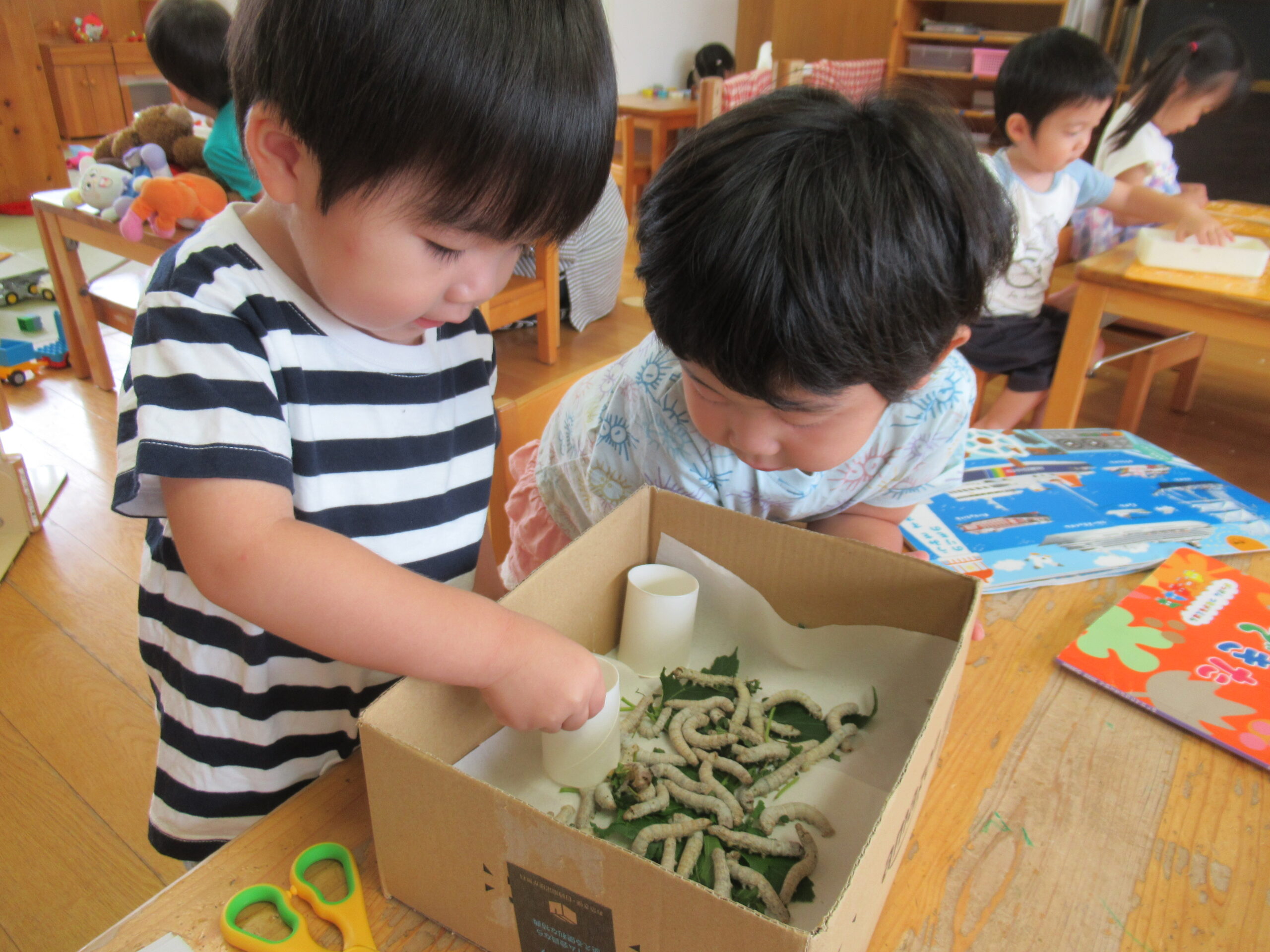 心組で育てている蚕が大きくなり、少しずつ繭を作り始めていたので、子どもと一緒に繭が出来るためのお部屋を作りました。すでに繭になっているのもあり、「白くて少し硬いね」「もっと出来るかな」と繭が出来ることを楽しみにしていました。