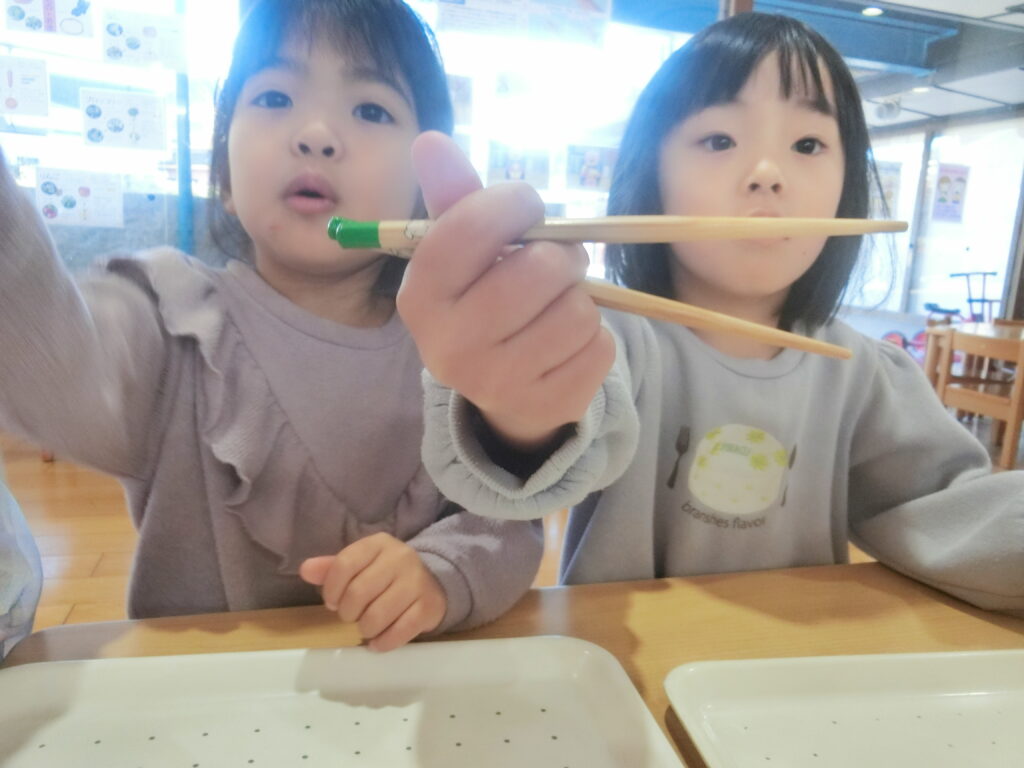 調理室SDGs週間として1月末まで朝のお手伝いの時間に『捨ててしまいがちな野菜の皮や軸などを調理して食べてみよう』という取組みを行っています。食品ロスを減らすこともできるし、皮にも栄養が含まれているので人にも環境にもやさしい取組みです。えのきの根本のバター醤油焼きもとっても美味しくて大人気でした。今日は人参の皮です。子ども達にどんな味付けで食べたいか聞いて、砂糖と醤油で甘辛く味付けしました。「いつもの人参とちょっと違う」、「おいしい!もっと食べたい」とおかわりもあっという間になくなり、捨ててしまう食材も工夫次第で美味しく食べられることを知りました。また、一緒にお箸の持ち方も確認しました。集中して練習できる貴重な時間となっています。