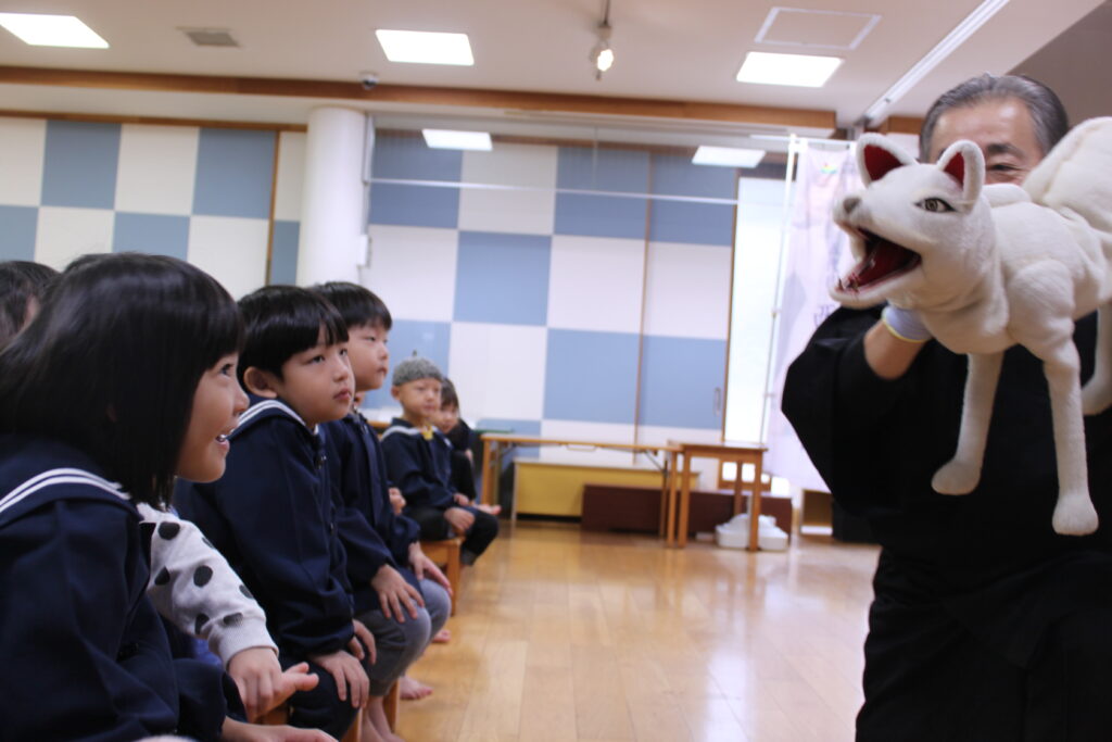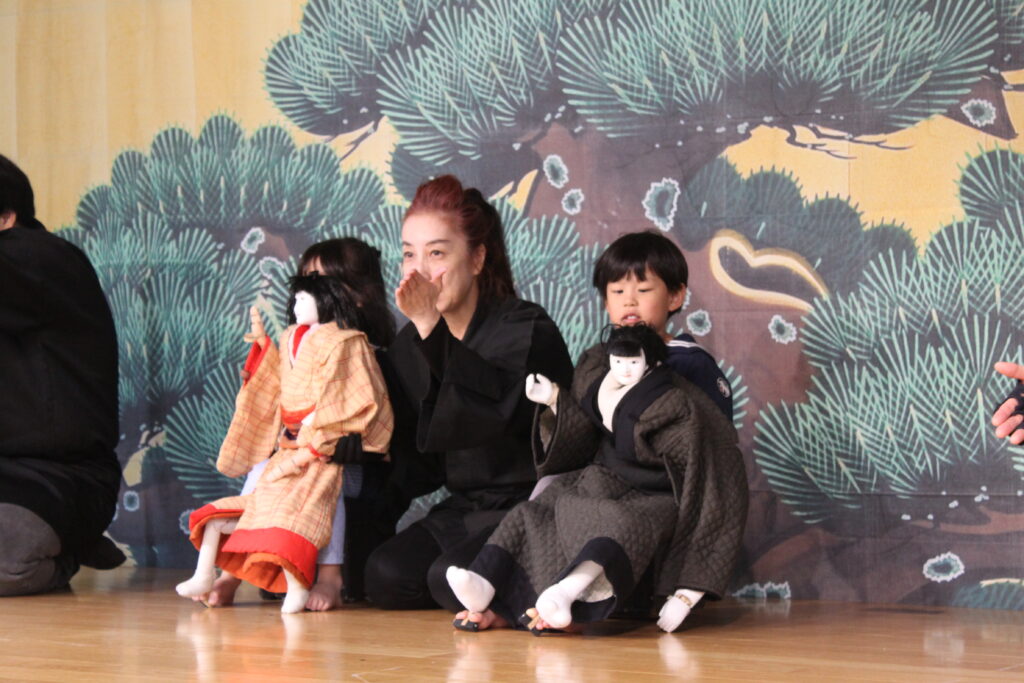 江戸時代から伝わる車人形を鑑賞しました。3つの車がついた箱形の車に腰かけて一人で操る、特殊な一人遣いの人形芝居の魅力に釘付けの子どもたち…