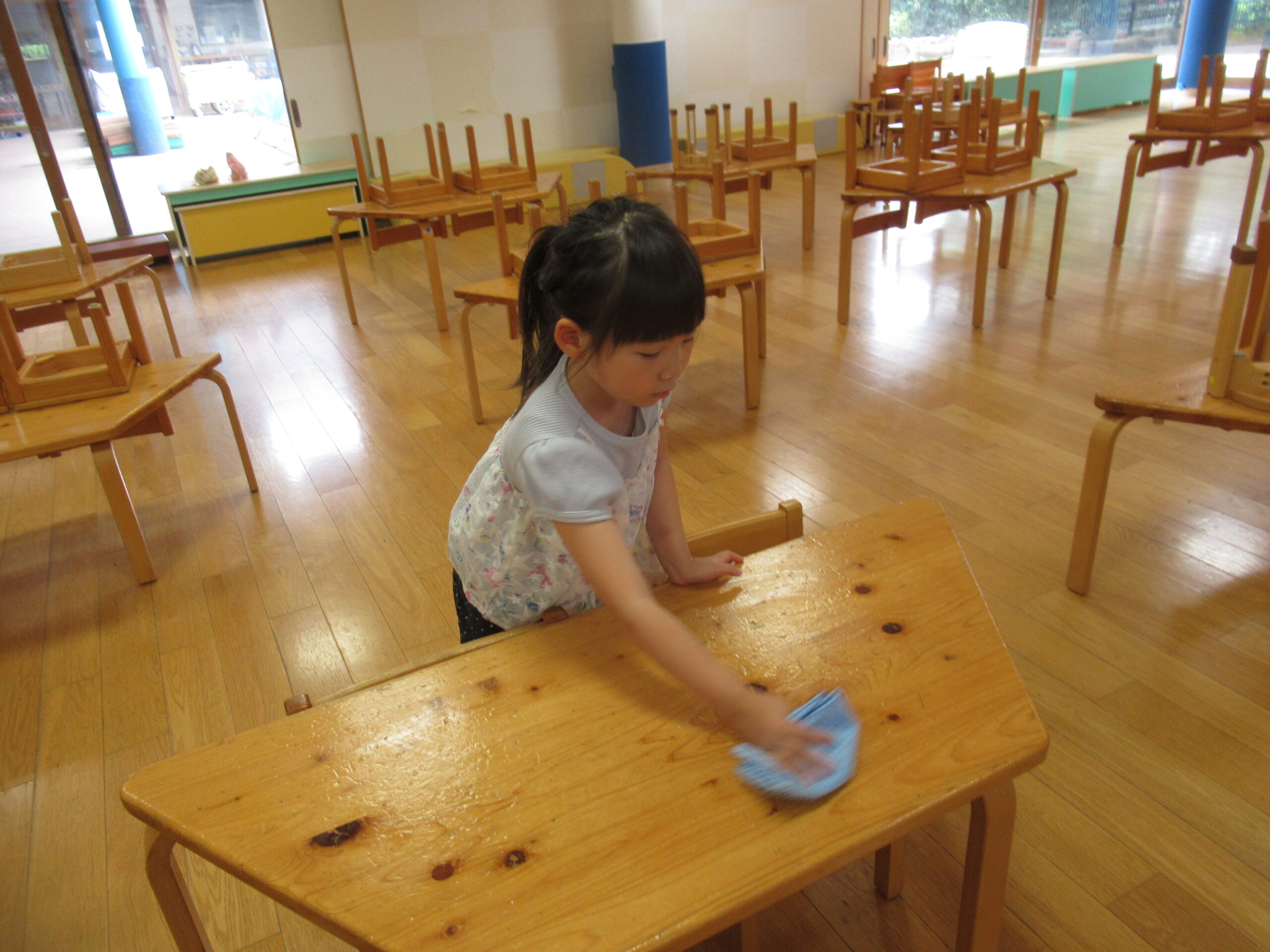 道組の子どもたちがグループに分かれて毎日交替で当番活動をしています。給食の配膳や後かたずけが当番の仕事です。道組になって早2か月が過ぎ、テーブル拭きや雑巾がけの手順も身に付いて、てきぱきと動く子どもたち。このような活動を通して道組としての自覚が芽生え、頼もしく成長しています。