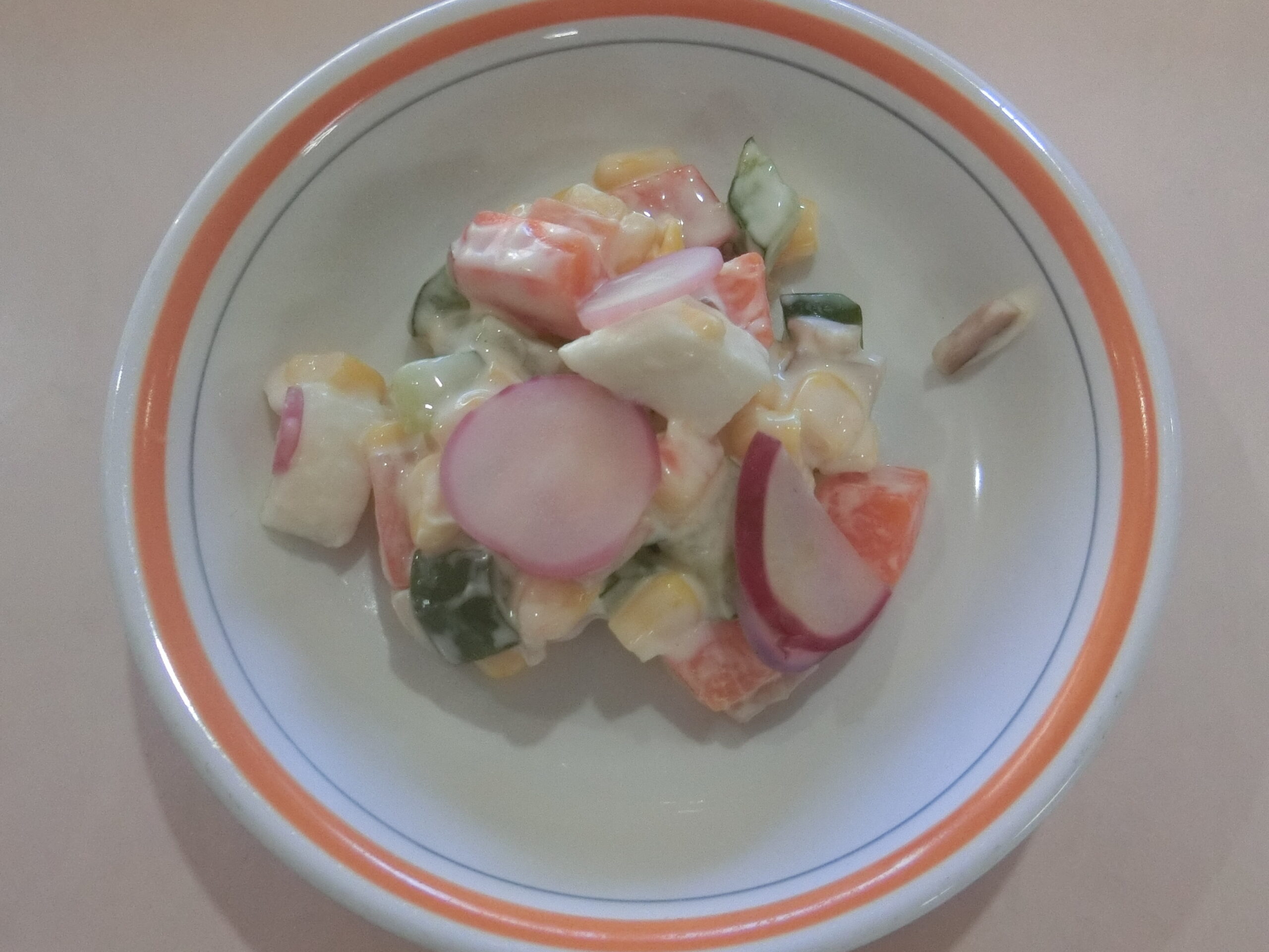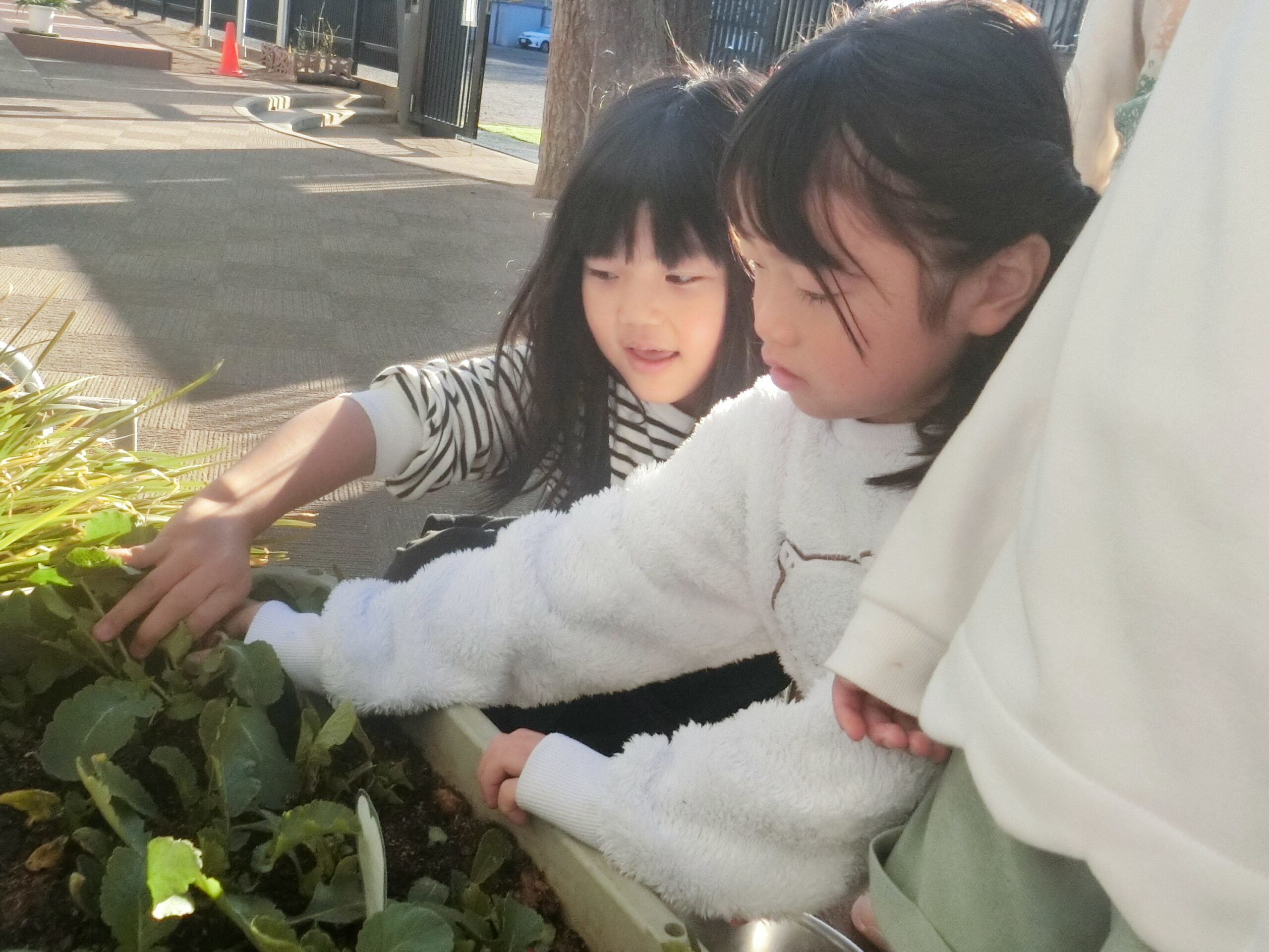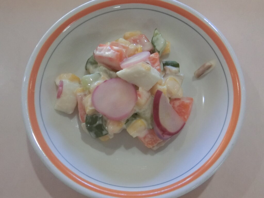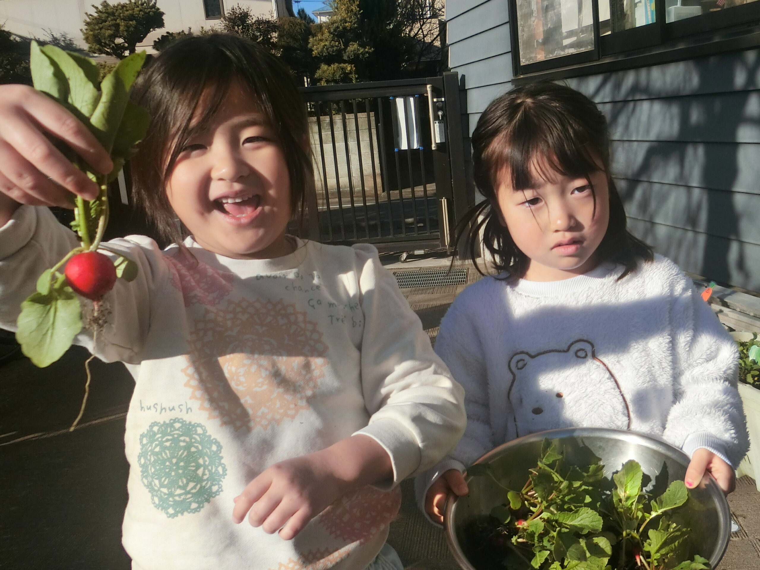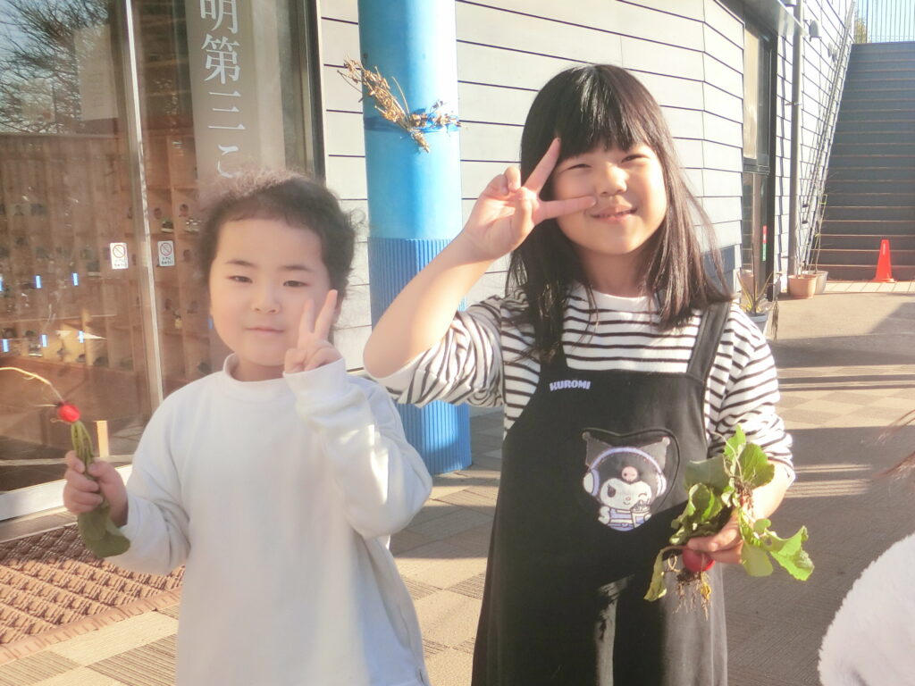 大きいものや、とってもちいさくてかわいいラディッシュなどたくさん採れました。「給食のサラダに入れたーい!」「園長先生に教えたい!」と元気いっぱいです。子どもたちの要望もあり、幼児クラスでは給食のはんぺんサラダに赤くてかわいいラディッシュを入れ、おいしくいただきました。