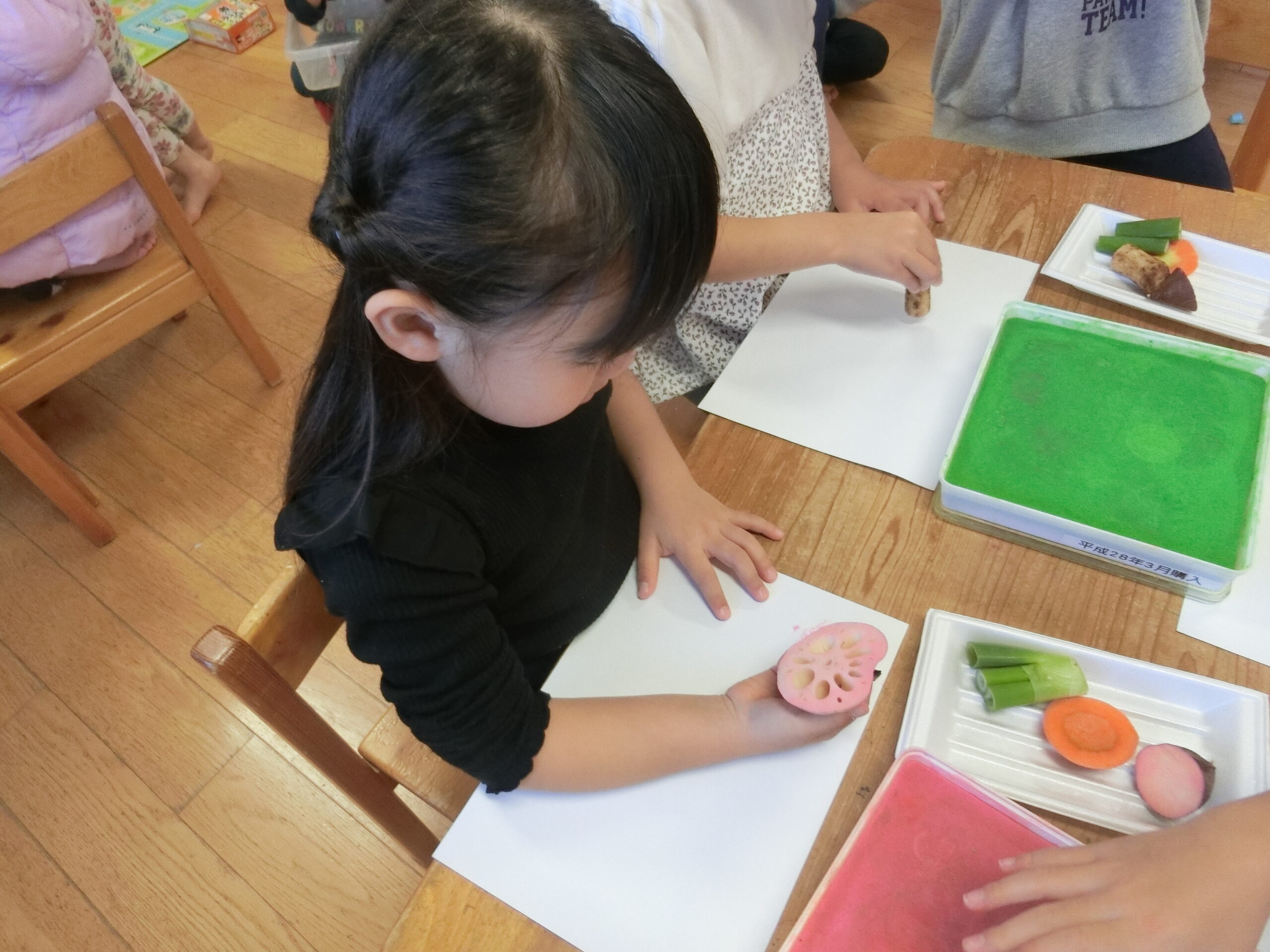 今日は朝の食育活動で、野菜スタンプをしました。