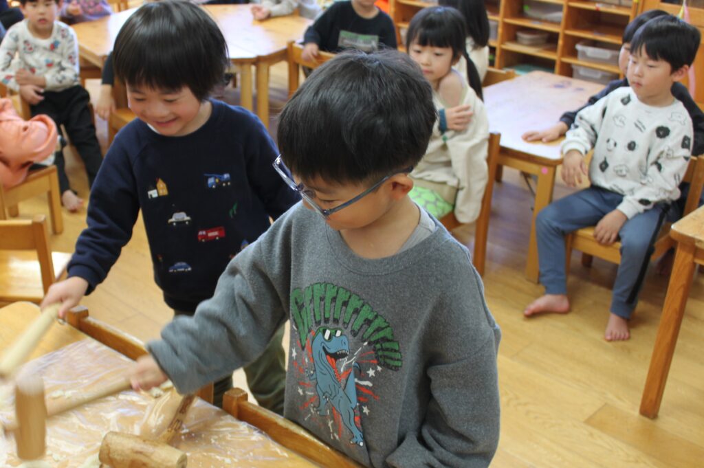 鏡開きをしました。調理の先生から由来の話を聞き、お正月にみんなが元気で過ごせますようにと神様に願って飾っていたお餅をありがとうという気持ちを込めて木槌で割りました。やさしくたたく子、年長さんになると力強くたたく子、様々でしたが思いを込めてたたきました。今年一年元気で過ごせますように。