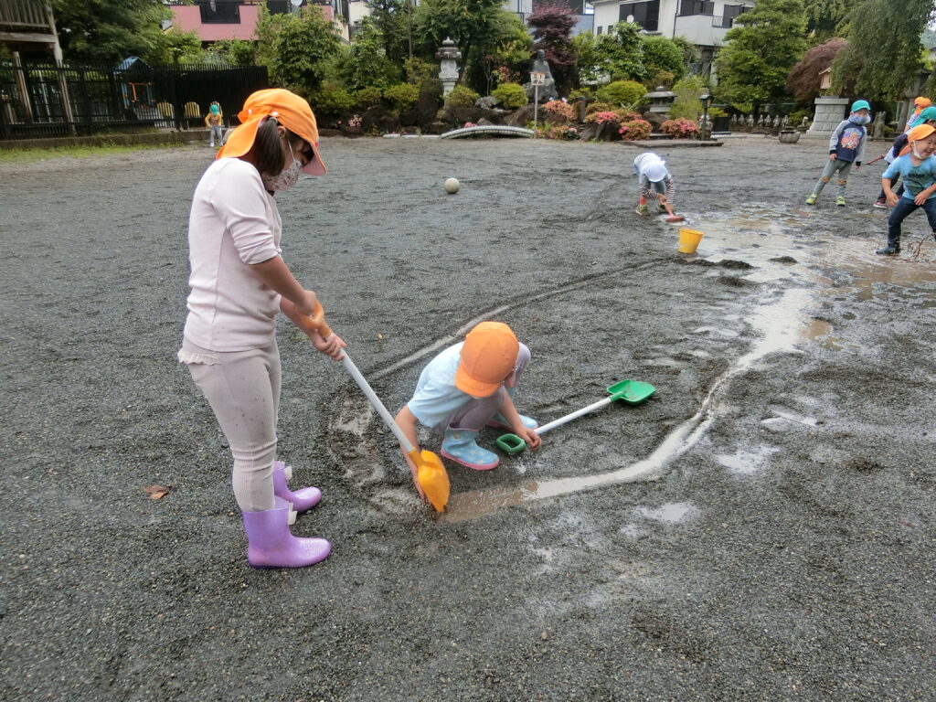 空チーム。雨上がり楢の里広場で遊びました。水たまりを飛び越えたり、道を作ってどうやったら水が流れるか考えたり、自然を遊びに取り入れるのが上手な子ども達です。期待していたカタツムリは見つかりませんでしたが、コクワガタを見つけ大興奮の子ども達でした。