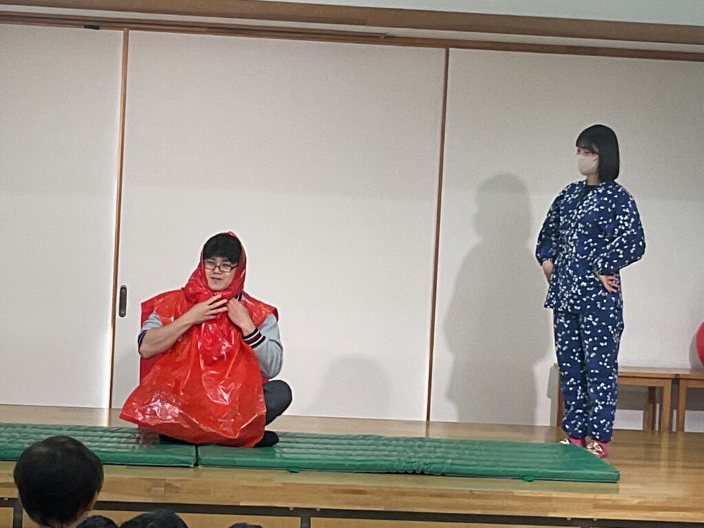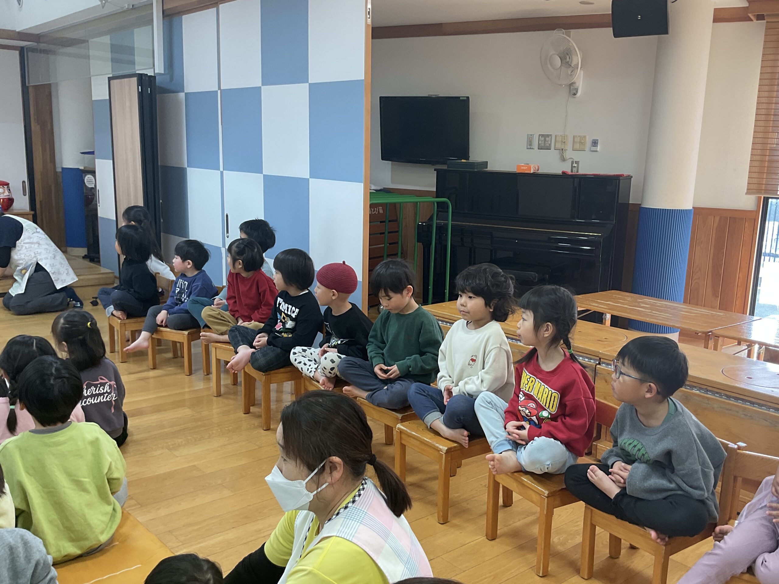 その後のお楽しみ会では、保育者による「しゅぎょうだるまのだるまん」の劇が行われ、だるま役や周りの動物役が転がる場面では子どもたちも笑顔に。最後の坐禅のシーンでは、子どもたちも足を組んで真似をしながら楽しく参加していました。