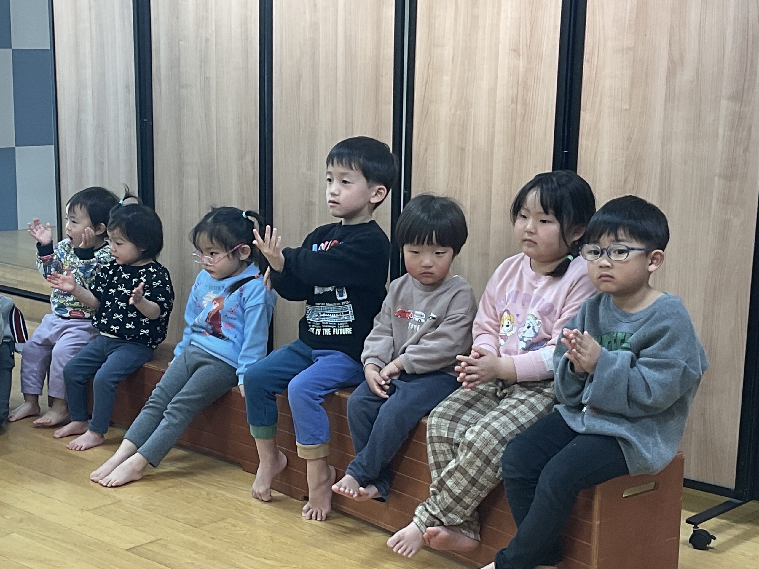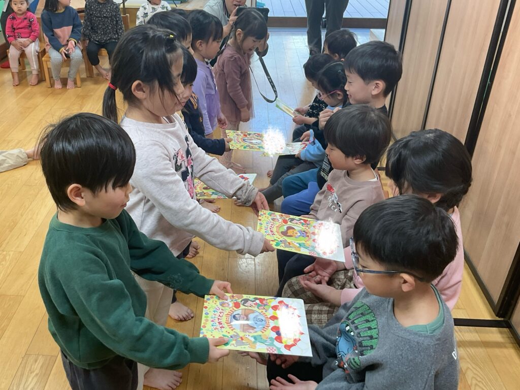1月のお誕生会がありました。誕生月の子どもたちが前に出て、自分の名前や友達からの質問に緊張しながらも嬉しそうに答え、成長した姿を見せてくれました。