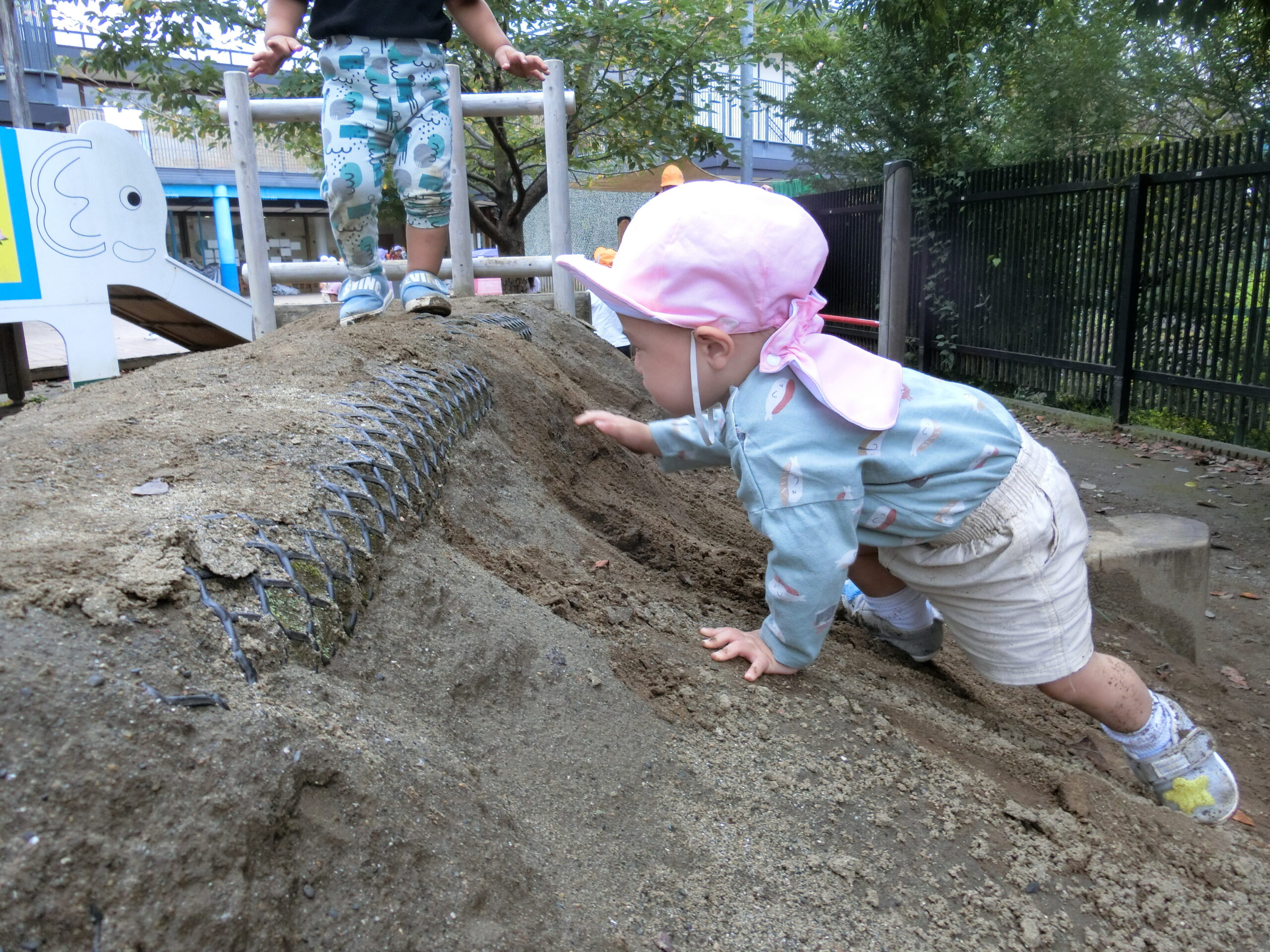 今日は、園庭で元気に遊びました。この頃、滑り台や築山登り、アスレチックに挑戦しようとする姿が多くみられるようになりました。はじめは、お兄さん・お姉さんの真似をして登ろうとしていました。繰り返し登ることでコツがつかめ、楽しんで出来るようになりました。