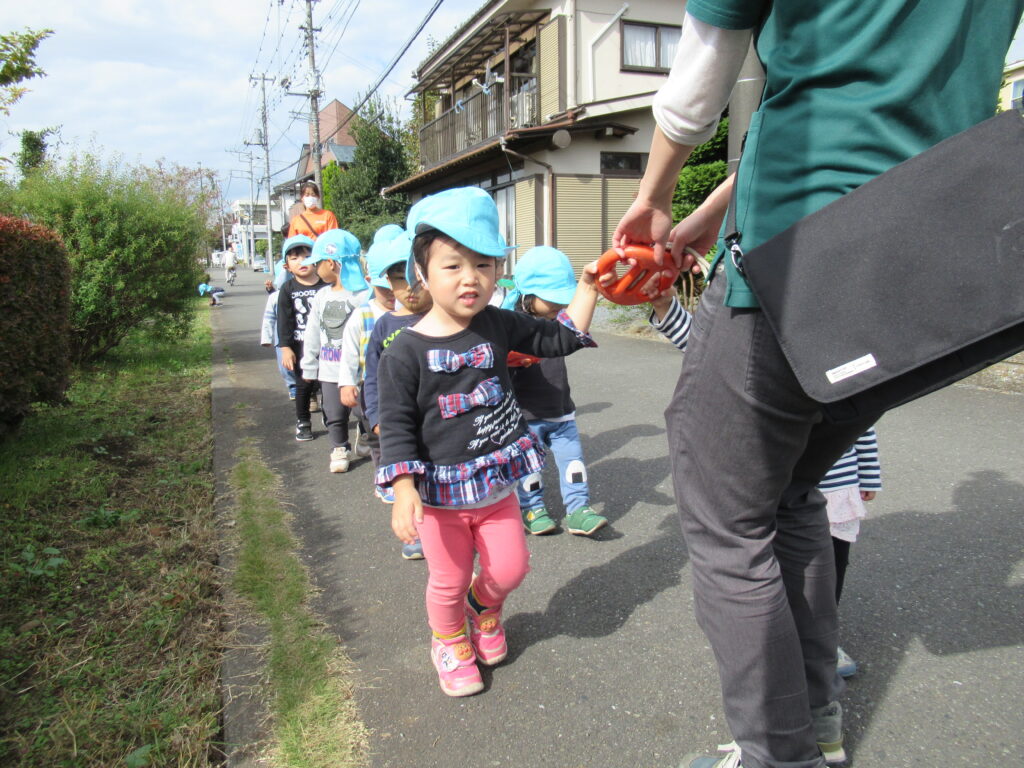 2歳児★お散歩が大好きなこどもたち!体力もついてきて以前よりも長い距離を歩けるようになり、元気いっぱい【さんぽ】を歌いながら園の周りの川沿いを1周しました♪