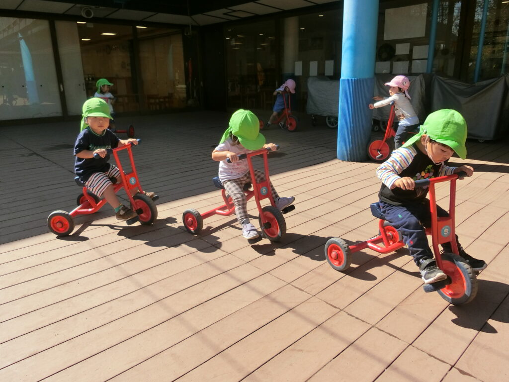 三輪車が好きな子どもたち。以前は足がペダルに届かず地面を蹴って進んでいましたが、成長と共にペダルを踏んで前に進めるようになってきました!友達の姿に刺激され”僕も私もやってみるぞー!”とみんなで楽しんでいました☆