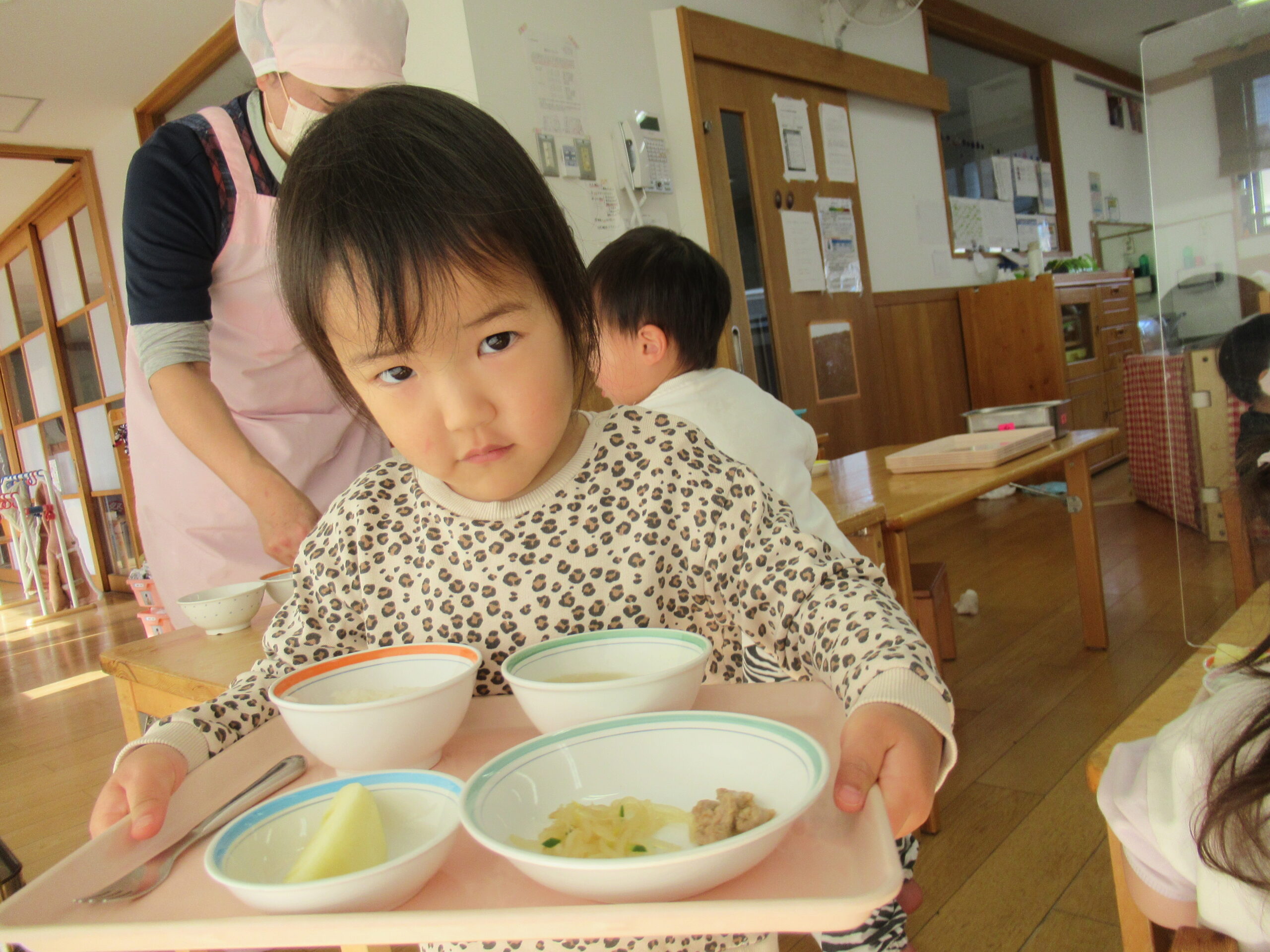 来週からは1階のランチルームで幼児クラスと一緒に給食を食べていきます。
