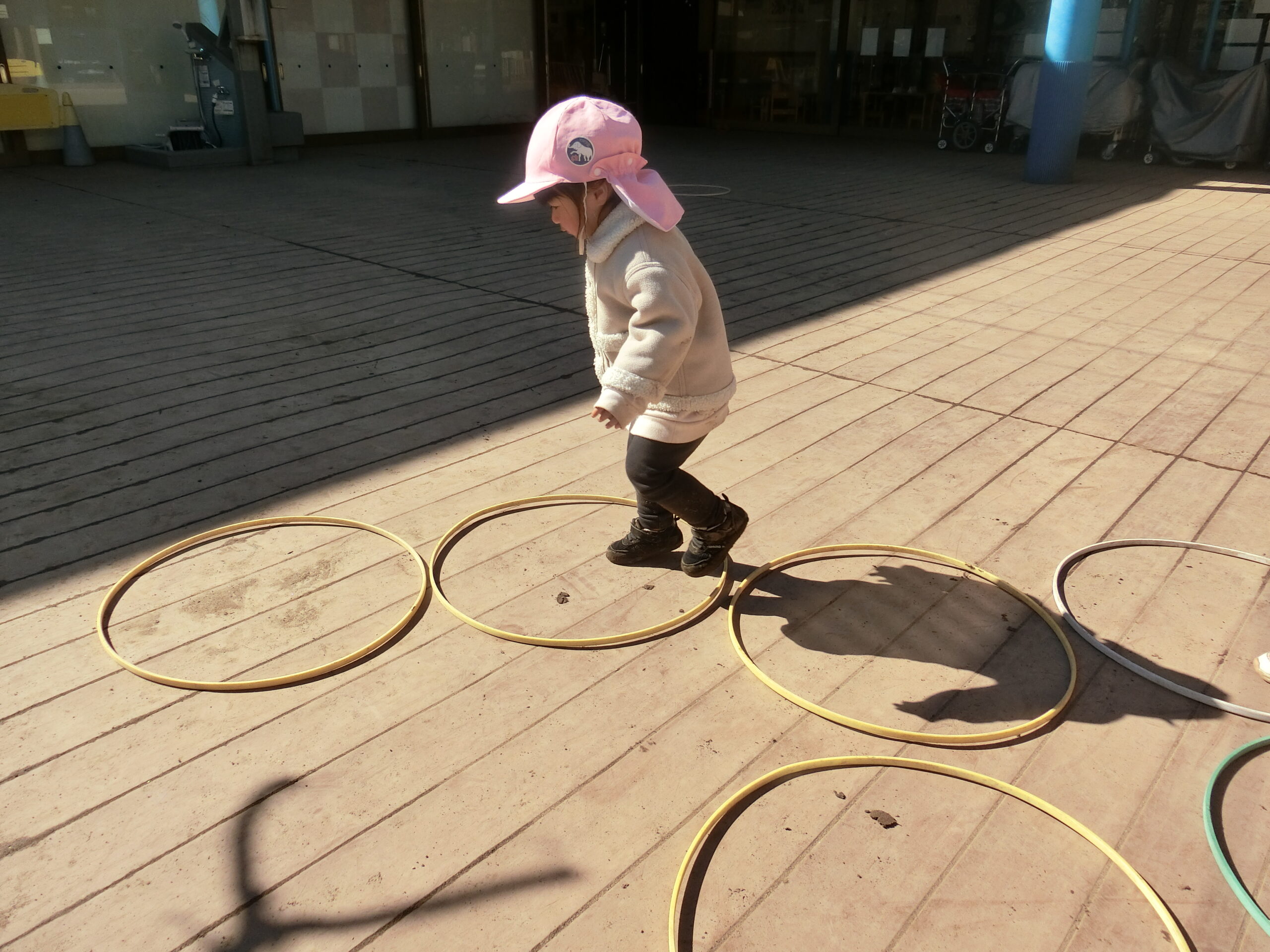 「お外に出て遊ぼうね」と声を掛けると「わーい」と嬉しそうな声をあげた光組(1歳児)さん。園庭に出ると、大きいクラスの子がフープでケンパーをしているのを見つけ、じっと見ていた子どもたち。そのうちに真似をしてやってみたくなったようで、ケンケンに挑戦。上手に跳べると嬉しそうな笑顔を見せてくれました。