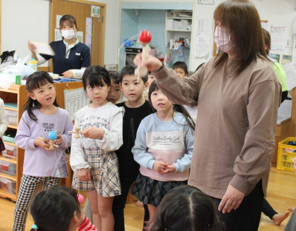 幼児の各チームに駒回しやけん玉の披露をする道組さん!