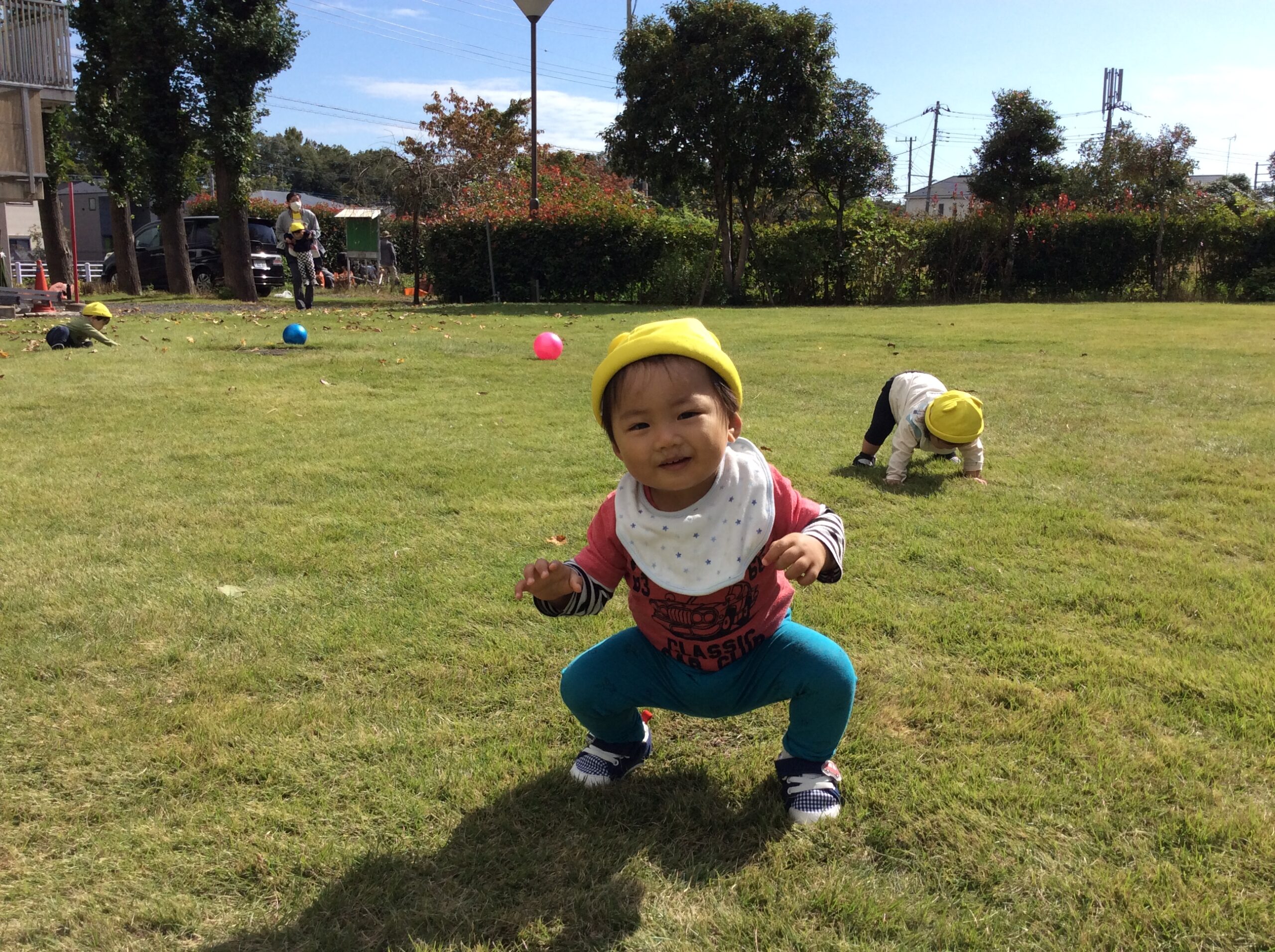 歩けるようになった子が増えた0歳児純組さん。楢の里の中庭に行くと、中庭全体を探索するようになったり、少し走ったりするようになったりと成長を感じました。ボールにも夢中で、1歳児輝組の友達と一緒にボールを追いかけ、ポンと飛ばして楽しんでいました。