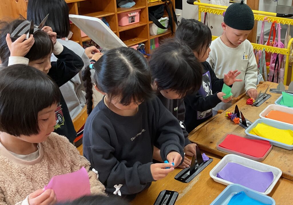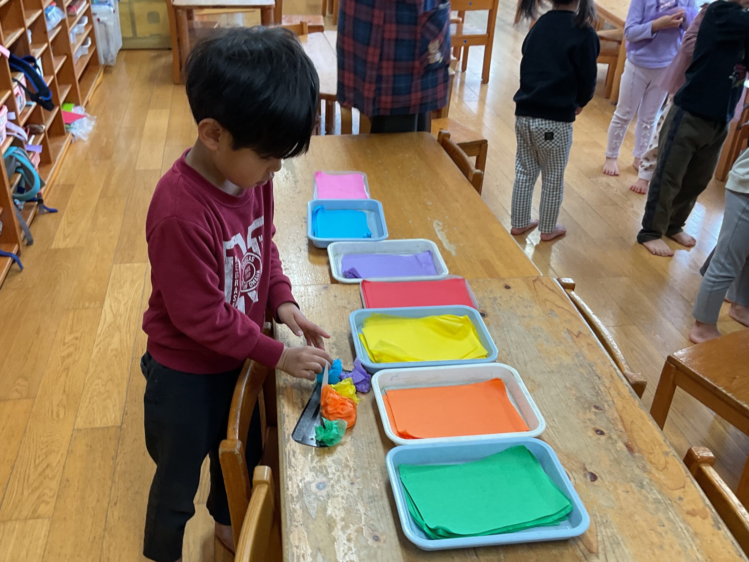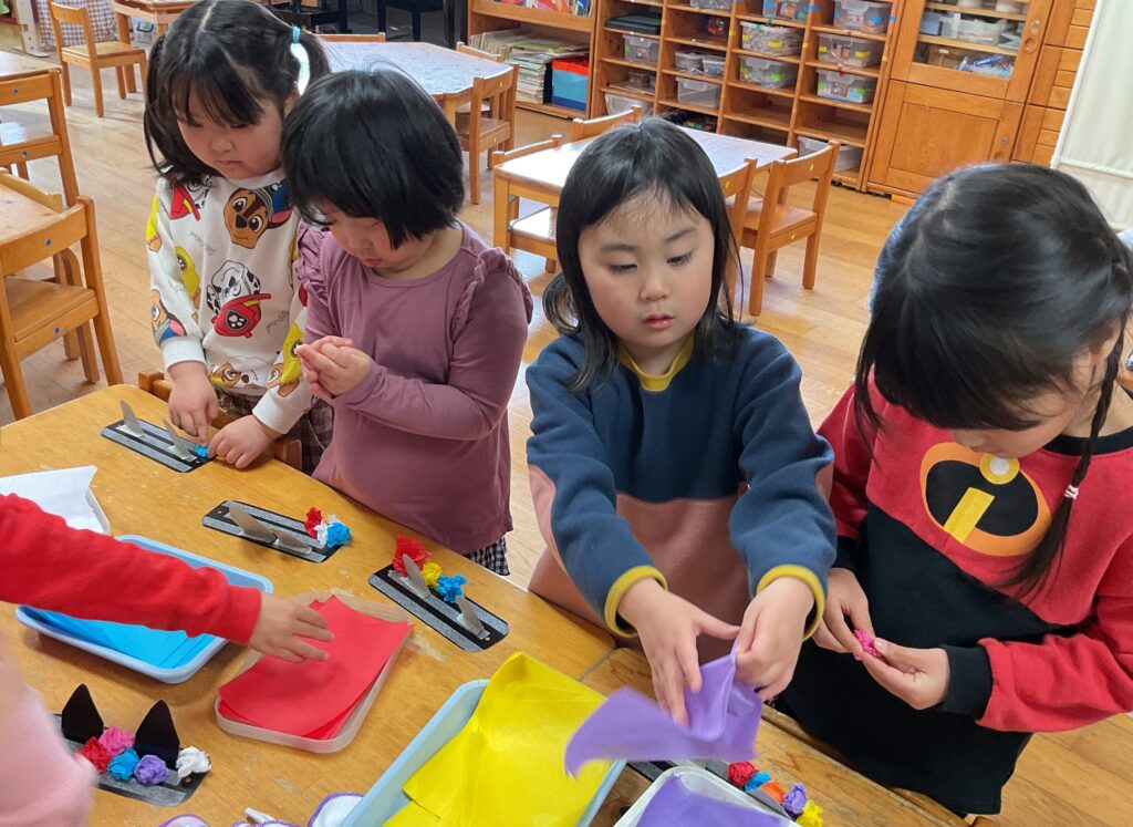 節分に向けて、鬼の被り物を制作しました。活動の内容を伝えると、「作りた~い!」と嬉しそうに声をあげ、意欲的に取り組む姿が見られました。鬼の頭の部分はお花紙で飾りつけを行い、「何色にしようかな?」「どのくらいの大きさがいいかな?」と、それぞれが思いを巡らせながら、楽しんでいました。完成した被り物を手にした子どもたちは、「豆まきの日にこれ使うの~!」と、鬼が来ることにドキドキしながらも、当日を心待ちにしている様子が見られました。